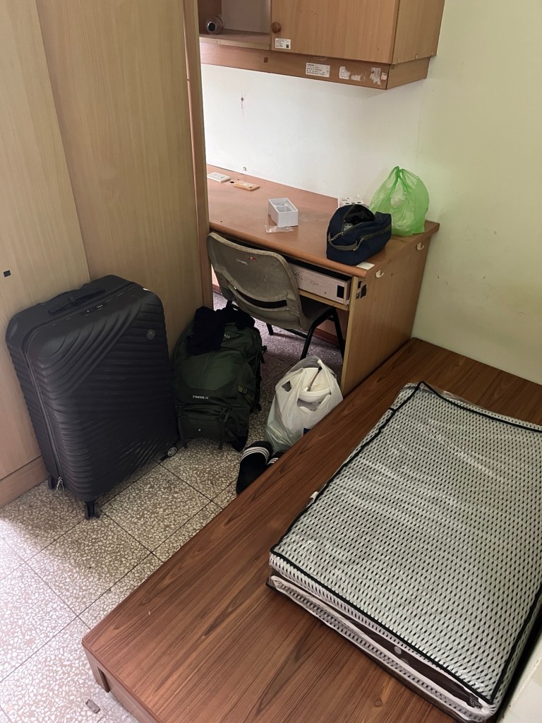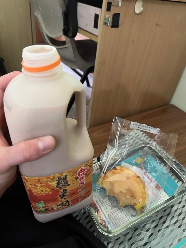 Ich bringe meine Sachen also rüber, und zwei der vier Betten sind bereits belegt, die Inhaber aber nicht im Raum. Der eine der beiden hat ein ganzes PC-Setup aufgebaut und seine sonstigen Sachen relativ unordentlich über sein Bett verstreut. Beim anderen sehe ich nur einen Koffer und eine Zahnbürste. Ich hoffe sehr, endlich mit Taiwanesen in Kontakt zu kommen. Zum Frühstück gönne ich mir zwei der Brötchen, die ich gestern gekauft habe und ein paar Schlucke aus der Braunen-Zucker-Sojamilch, made in Taiwan.