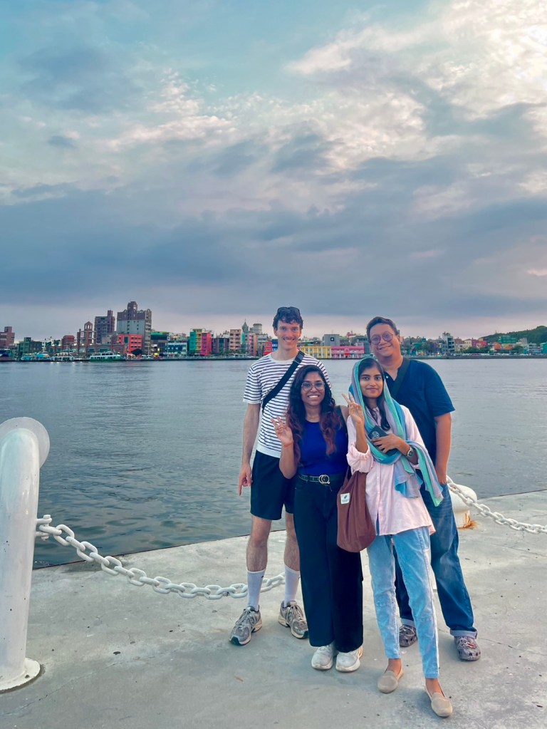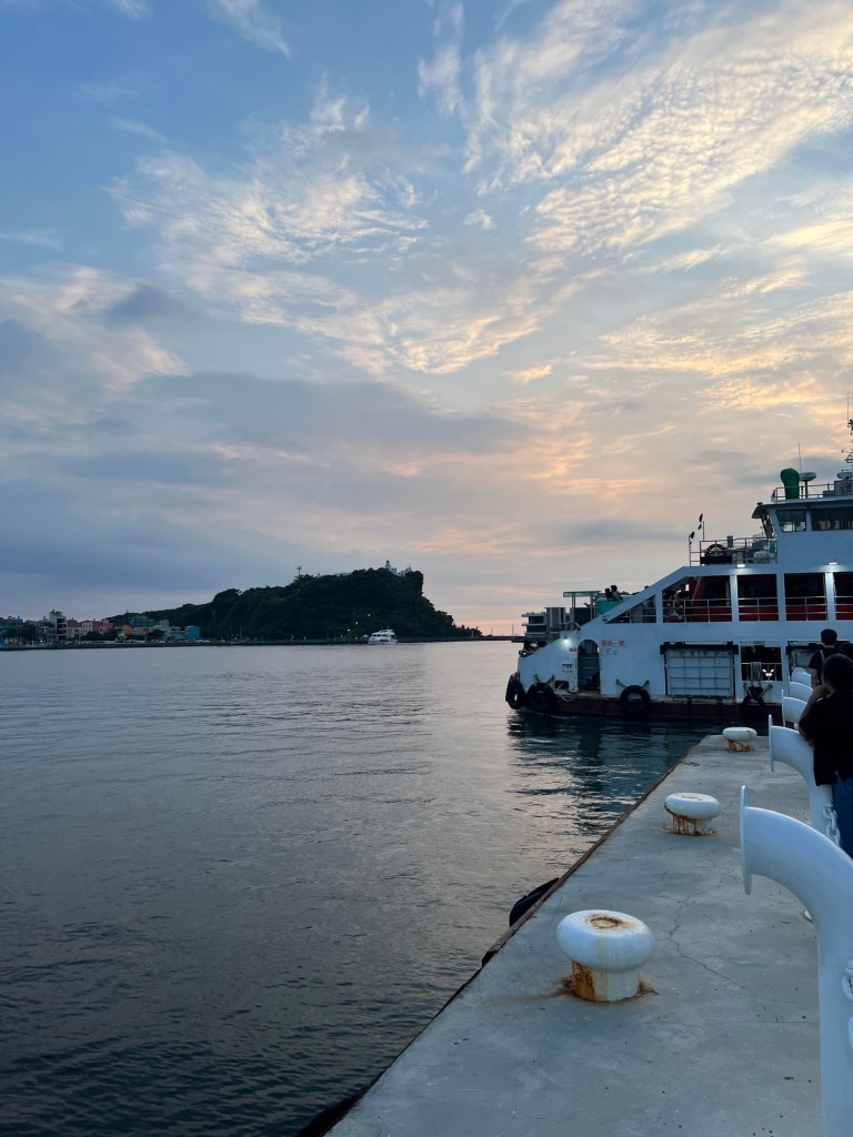 Da die Sonne immer weiter sinkt, machen wir uns auf den Weg näher zum Hafen Richtung Fischmarkt. Vor der großen Halle ist eine Mini-Halbinsel, von der aus nicht nur eine Fähre ablegt, sondern man auch einen sehr guten Blick auf die längliche Insel „Qijin“ hat, die den Hafen zu einem Binnengewässer macht. Nur am Rand gibt es kleine Bereiche, durch die Schiffe passieren können. Hier steht ein Liebesbaum voller roter Herzen (für viele ein Insta-Spot), wir sehen außerdem ein gelbes U-Boot neben einigen knallig angestrichenen Wohnhäusern direkt am Wasser und ein junger Asiate spielt Gitarre, während er auf Englisch ein Liebeslied singt. Dazu passend färben sich die Wolken in ein leichtes Orange.