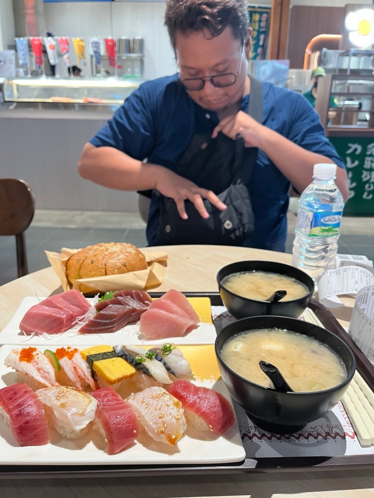 In der Halle setzen wir uns und bestellen gemeinsam Sushi (viel roher Fisch dabei) und jeder eine „Thuna-Miso-Soup“, nach der langen Lauferei ein einzigartiger Genuss.