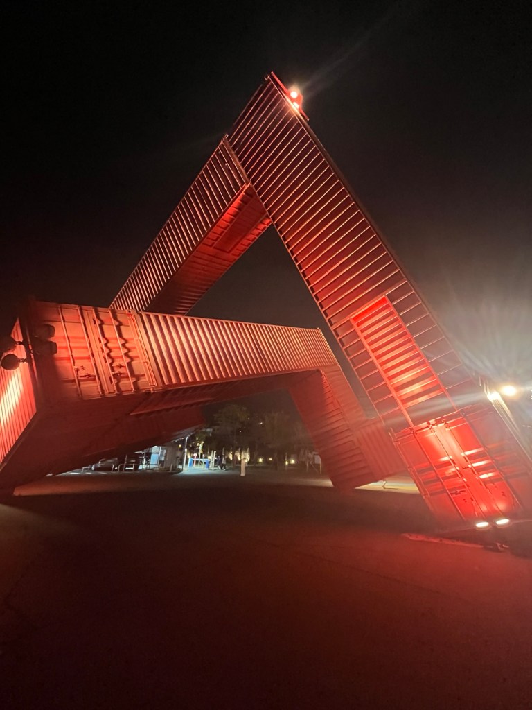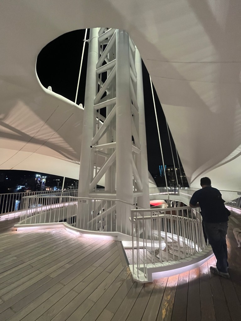 Auf dem Rückweg kommen wir noch kurz am „Kaohsiung Music Center“ vorbei, dürfen sogar in das Erdgeschoss reinschauen (beeindruckende Halle im Inneren), und setzen uns auf der Gebäuderückseite an den Pier, an dem wir erneut die Skyline bei Nacht genießen können.