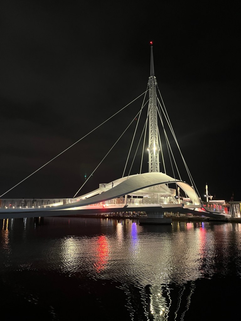 Als wir rausgehen, ist es bereits stockdunkel. Die Stadt ist aber hell erleuchtet. Den Hafen entlang, sind wir bald an der „Great Harbour Bridge“, die eine tolle Konstruktion ist, da sie alle auf Zug gespannten Bauteile an einem mittleren Mast auf sich vereinigt. Ihre charakteristische Form bekommt sie durch organisch gegossenen Beton, der wie alle Bauteile in strahlendem Weiß gestrichen ist.