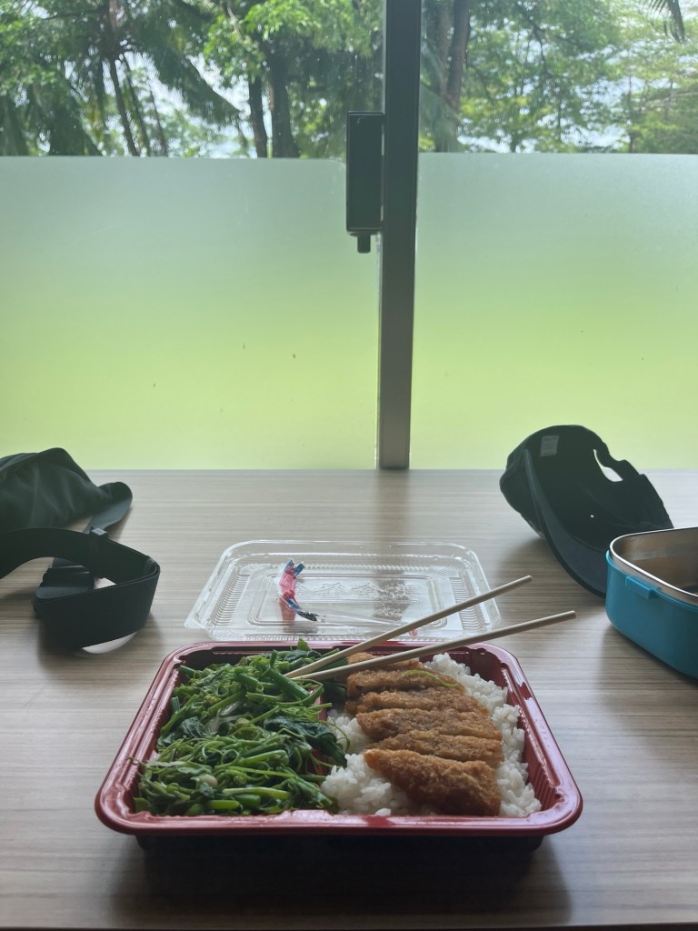 Später sitze ich mit Sky (meinem indonesischen Roommate) eine Weile im Gemeinschaftsraum, wo wir unser Mittagessen aus der Cafeteria einnehmen. Es gibt ausschließlich Fleischgerichte, ich als Pescetarier kann mich immerhin mit frittiertem Lachs abgeben, der gar nicht soo schlecht schmeckt.