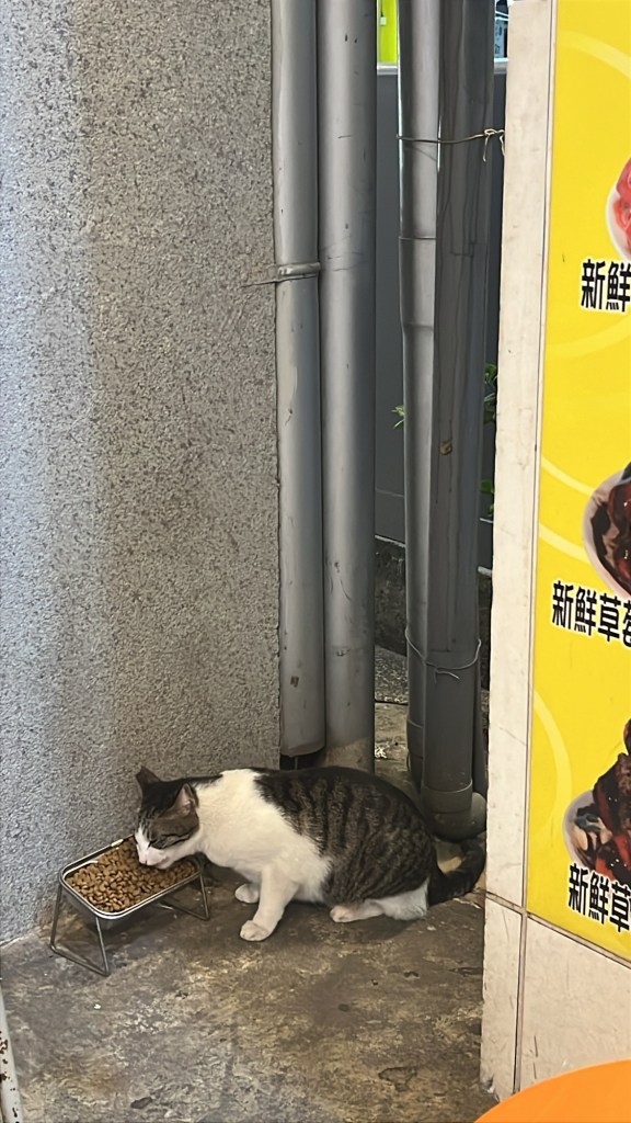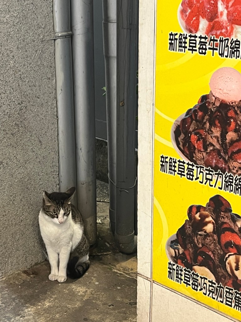 Während ich mein Eis esse, sehe ich eine total süße streunende Katze vor dem Laden sitzen, die offensichtlich auf Essen aus ist. Tatsächlich kommt eine Bedienung raus und stellt ihr eine sehr große Menge Trockenfutter hin. Meine Katze in Berlin hätte das locker für 2-3 Tage satt gemacht.