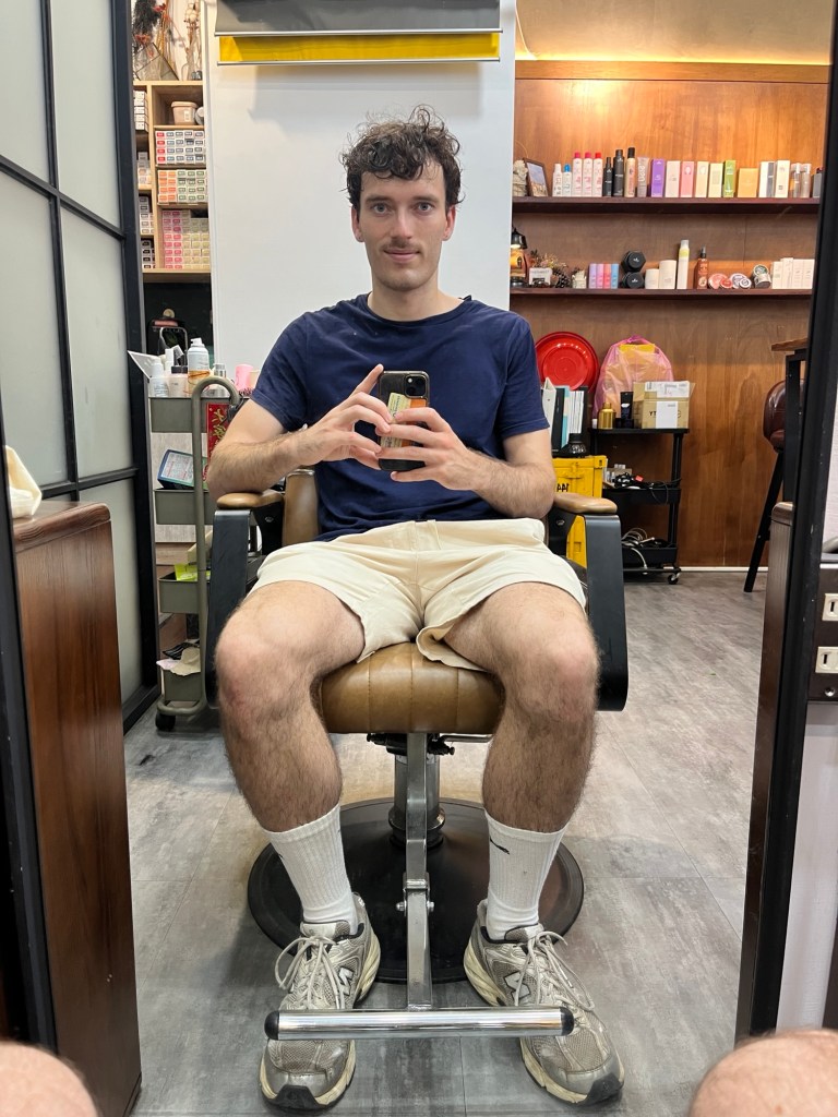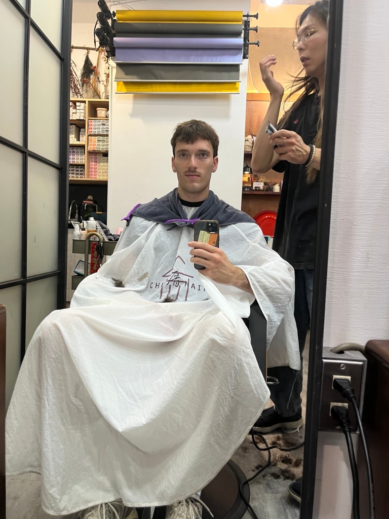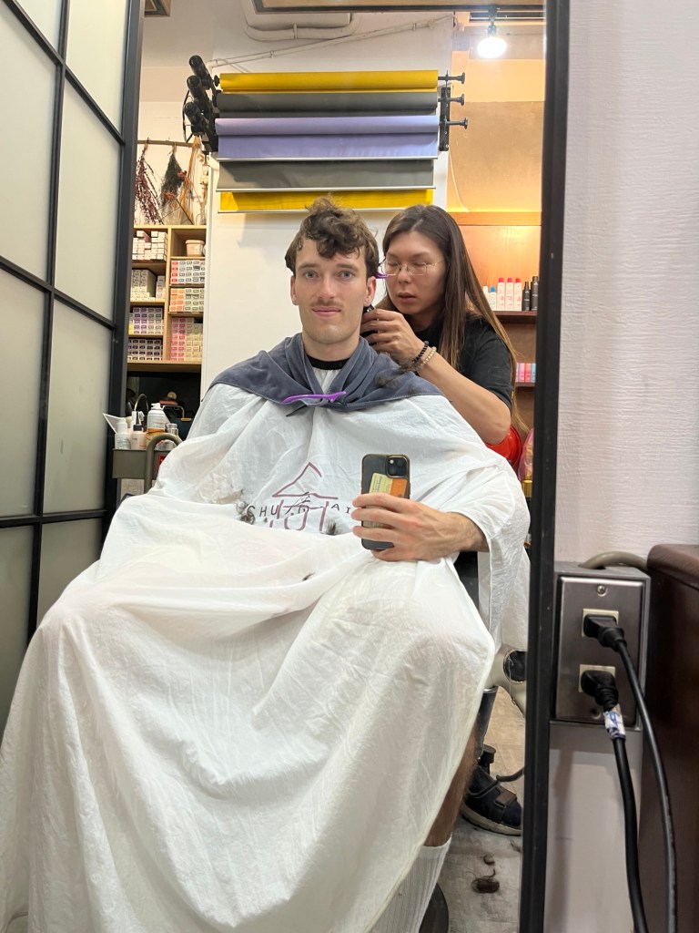 Bevor ich losgehe (Henry und Camille sind auf jeden Fall in der Stadt, und ich versuche heute mal einen Haircut zu bekommen), bin ich noch kurz im Zimmer und packe. Sky und Mike sind schon aus (gerade Sky ist sehr oft weg, auch abends, chillt viel mit seinen indonesischen Kumpanen), Heizo sitzt wie immer an seinem PC. Er fragt mich, wohin ich gehe, und ich frage ihn, ob er weiter Uni vorbereiten muss. Man sieht ihm an, dass er keine Lust hat, vermutlich wird er (wie ich schon öfter beobachtet habe) die meiste Zeit auf YouTube Shorts verbringen. Er erzählt mir, dass er sich sehr für Nachrichten und Politik interessiert (er hat ein Fenster offen, in dem es grob um Trump und Xi geht; die chinesische Militärparade zum 80. Jahrestag des Sieges über Japan mit den schlimmsten Gästen der Welt, Putin, Kim Jong Un, Min Aung Hlaing usw., ist vorgestern erst zuende gegangen); und parallel informiert er sich über deutsches und österreichisches Essen via Deutsche Welle. Einerseits geht mir der Gedanke durch den Kopf, was ein Opfer, sich den ganzen Tag YouTube Shorts anzuschauen, gerade wenn man in so einem schönen Land lebt, andererseits informiert er sich immerhin und wohnt natürlich auch hier, was das für mich Spannende für ihn zum Gewöhnlichen macht. Ist natürlich zu hart geurteilt, ich weiß. Ich selber verbringe abends ja auch nicht gerade wenig Zeit am Mobiltelefon.