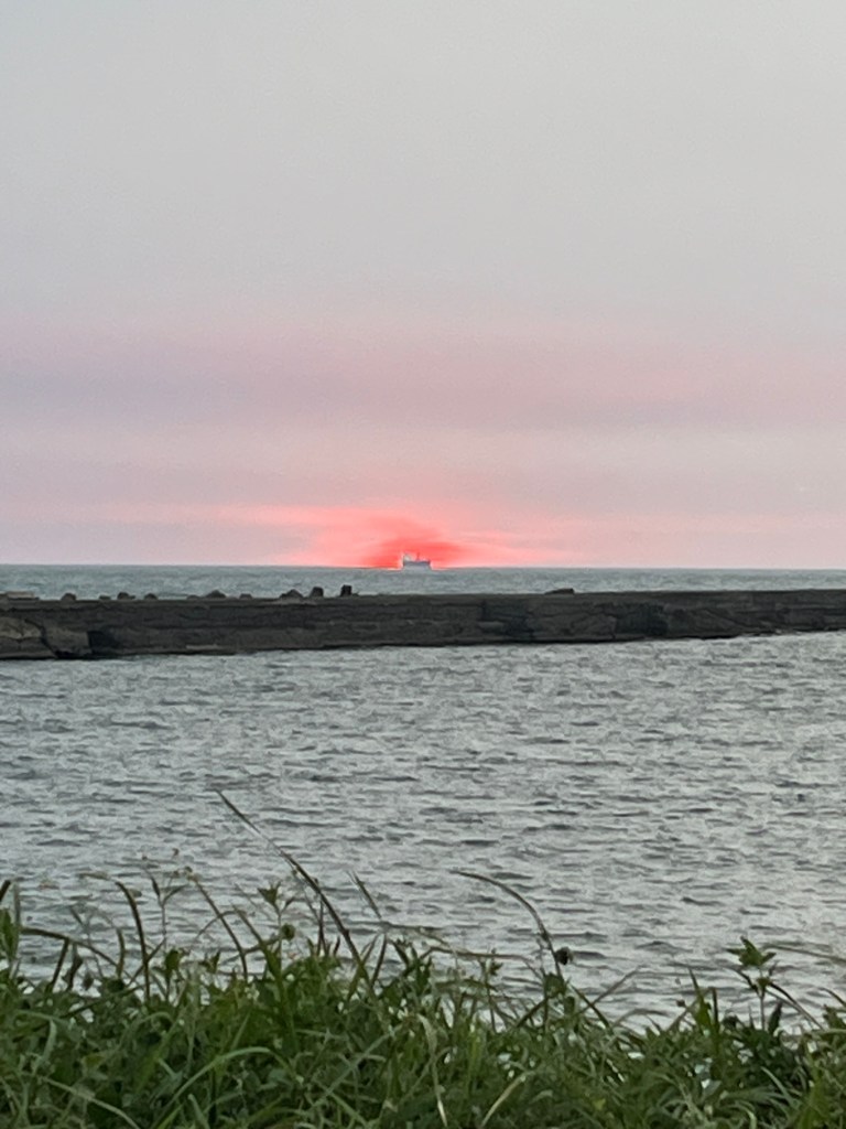 Leider darf man nicht auf die Mole laufen (Gefahr großer Wellen usw.), das wäre definitiv mein Sehnsuchtsort gewesen. In einer Gerade inmitten der Wellen ins offene Meer hineinlaufen, nichts um einen herum, sowas liebe ich, und in Urlauben gehe ich immer an solche Orte. Es ist trotzdem schön, den Rand der Insel abzulaufen und trotz Wolken kommt die Sonne hervor, kurz bevor sie untergeht. Blutig rot ist sie, und als wäre es gewollt, geht sie exakt hinter einem Schiff unter, welches eine wunderschöne Silhouette erzeugt. Meine Kamera ist leider etwas zu schlecht, um den Moment realitätsgetreu wiederzugeben, aber was soll’s, am schönsten ist es ja eh vor Ort.