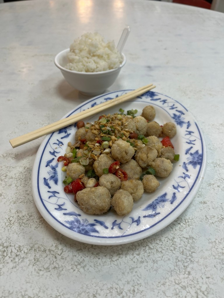 Auf der Insel sehe ich noch eine sehr schöne Kirche mit leuchtendem Kreuz (die will ich bestimmt mal zeichnen) und werde von einem Verkäufer auf der Straße in sein Restaurant reingelockt. Bei einer riesigen Auswahl Fisch bestelle ich die frittierten Oktopuslippen (ja, das Gericht heißt wirklich so) für 150$TD, ca. 4,50€; Reis aus einem monströs großen Reiskocher darf ich mir dazu auftun, so viel ich mag. Ich komme nicht umhin, auf dem Rückweg noch ein Eis zu verschlingen. Milk Tea mit Jelly und Tapioka ist schon pervers geil. So langsam mache ich mir echt Sorgen um meine Ernährung…