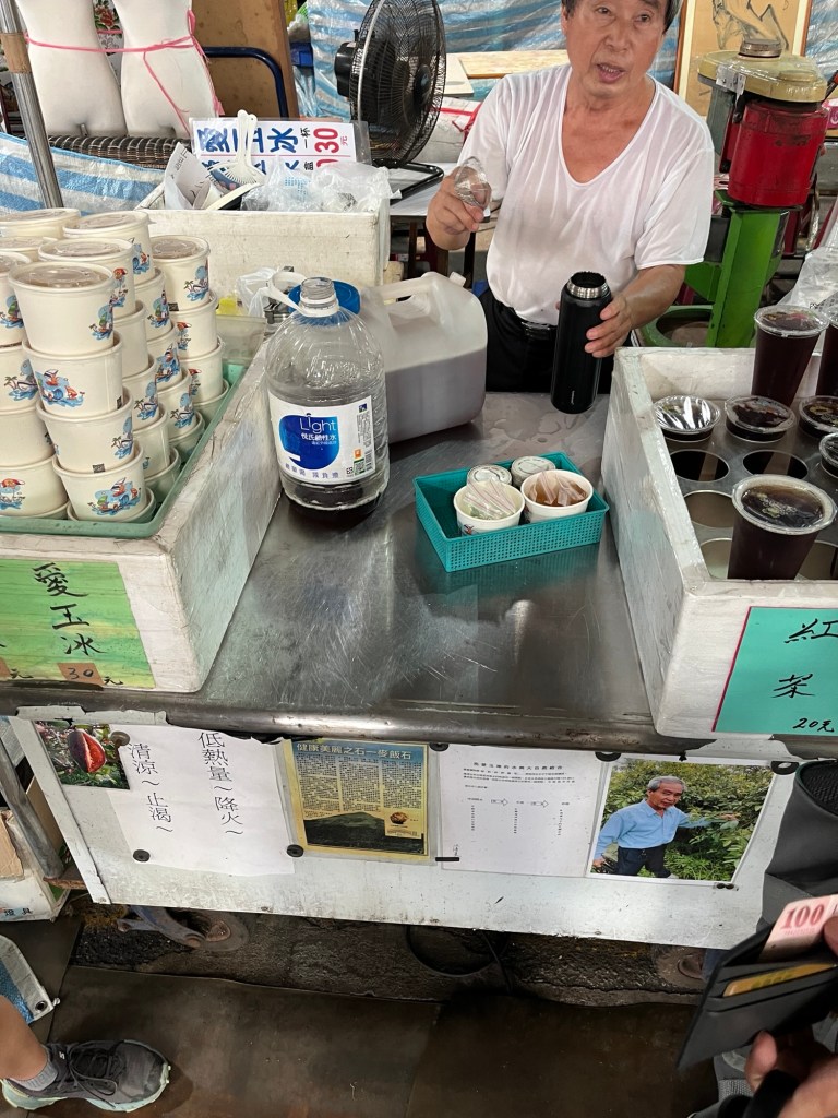 An wenigen Ständen werden Getränke angeboten, und wir lassen uns einen angeblich originalen taiwanesischen „Tea“ zusammenmixen. Es kommt uns zugute, dass Mike bereits auf B2-Niveau Mandarin spricht, denn wie so oft kann hier kaum jemand Englisch.