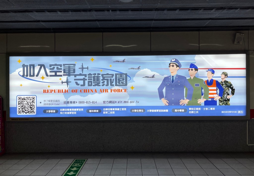 Nach zwei Stunden Pause fahre ich wieder los. An der U-Bahn-Station „Zuoying“ liegt ein weiterer dieser schönen grünen Hügel in der Stadt, eine ausgeschilderte Aussichtsplattform verspricht weiten Ausblick. An der Station selbst fällt mir noch eine Werbetafel auf, die mal wieder im cartoonhaften Stil dargestellt ist (wirklich egal welches Thema, alles hier wird verniedlicht). Nicht weniger als in die Taiwanesische Luftwaffe Wolle man eintreten.