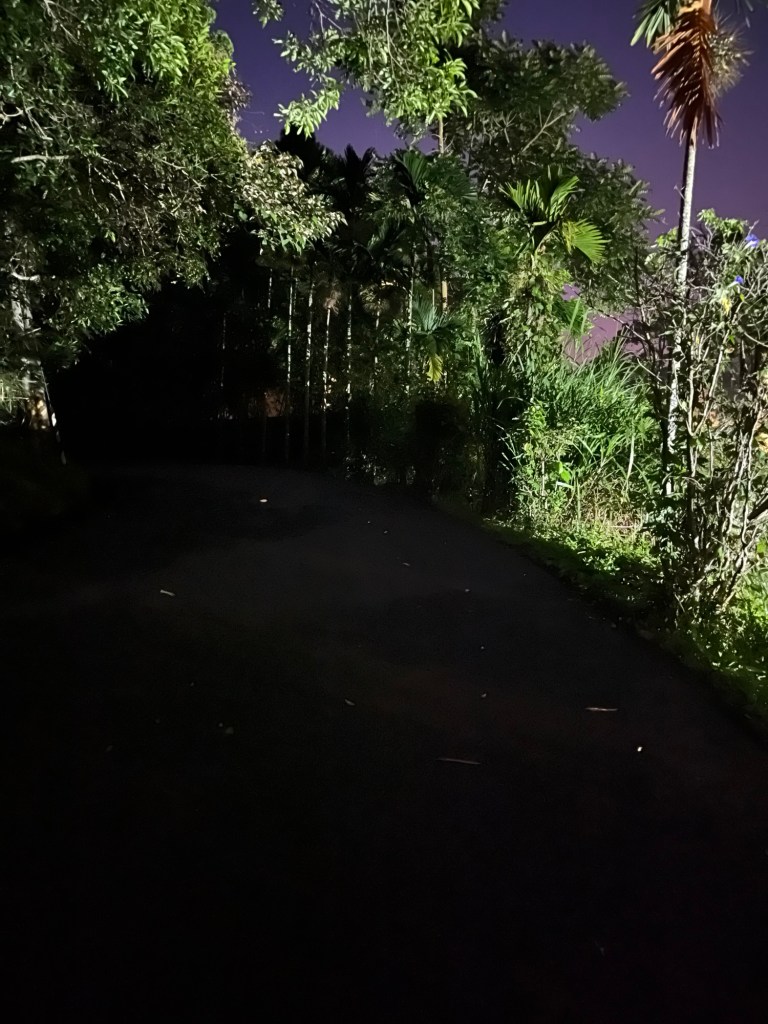 Im 7/11 sehe ich eine Reinigungskraft, die Straßen sind weitgehend wie leergefegt. Auf einer langen Geraden zischen zwei Motorroller durch die Nacht, außerdem komme ich an einem Auto vorbei, dessen Motor und Lichter zwar an, die Scheiben aber verspiegelt sind. Ansonsten ist da aber nichts. Am Rand der Siedlung biegt eine Straße steil nach oben ab, und dort ist auch der Wanderweg ausgeschildert, den ich suche.