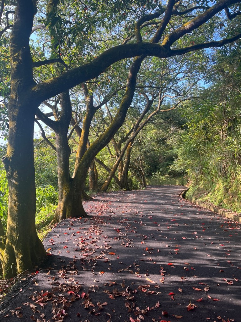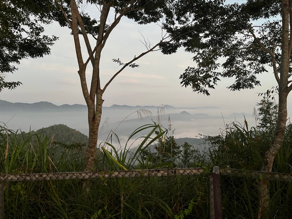 Der weitere Weg ist eine schlichte Straße, die wohl zu einer ausgewiesenen Wetterstation führt. Zwischendurch komme ich immer wieder an kleinen Aussichtsplattformen am Straßenrand vorbei, die teilweise über Nacht mit Spinnenweben versehen wurden. Mehrfach muss ich etwas wild um mich schlagen, weil ich nicht sehe, aber spüre, dass irgendwas an mir herumkrabbelt. Ich bin wie selbstverständlich in kurzer Hose und Tanktop aus dem Haus gegangen, aber tatsächlich sind es (um kurz nach 5 Uhr) nur 19 Grad. Das ist mit Abstand das Kälteste, was ich bisher erlebt habe. Ein Blick auf den Wetterbericht zeigt aber auch, dass man hier fast schon eine andere Klimazone erreicht hat, im Vergleich zu Kaohsiung ist es hier jeden Tag um die 4 Grad kälter.