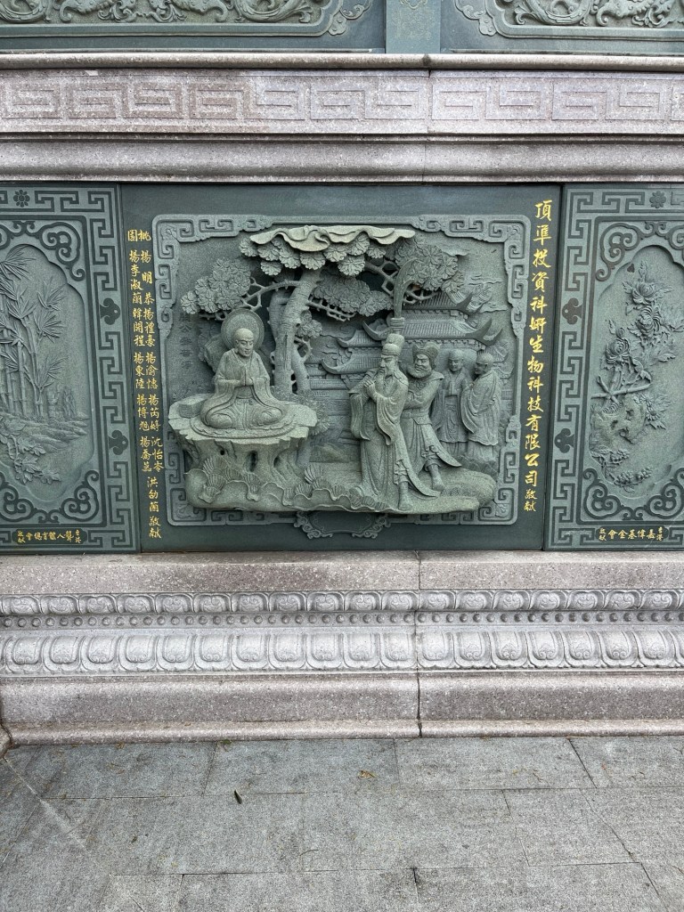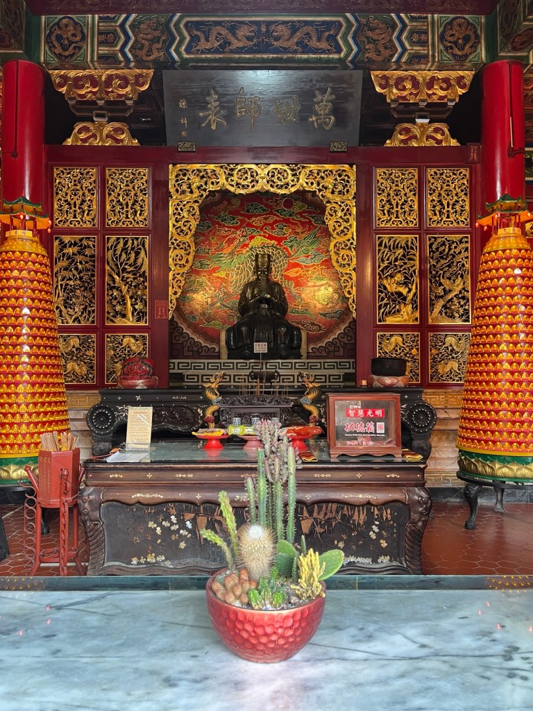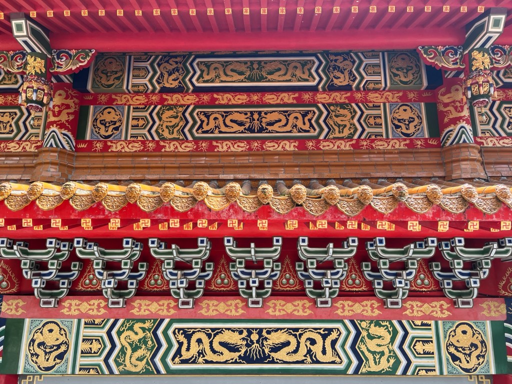 Der Wenwu-Tempel hat nach hinten mehrere Ebenen. Jedes Mal, wenn man denkt, man hätte die letzte erreicht, führt noch eine kleine Treppe den Berg rauf und ein neues Zwischengebäude erschließt sich. Selbstverständlich sind alle Säulen in rot gehalten (die Farbe muss auf jeden Fall eine spezielle Bedeutung haben) und es gibt nichts, was nichts verziert wurde. Wände, Decken, Balken, Dächer, Ränder, Altäre, alle sind entweder mit Figürchen geschmückt, wurden mit Mustern bemalt oder haben eingravierte Schriften. Das meiste in gold, versteht sich.