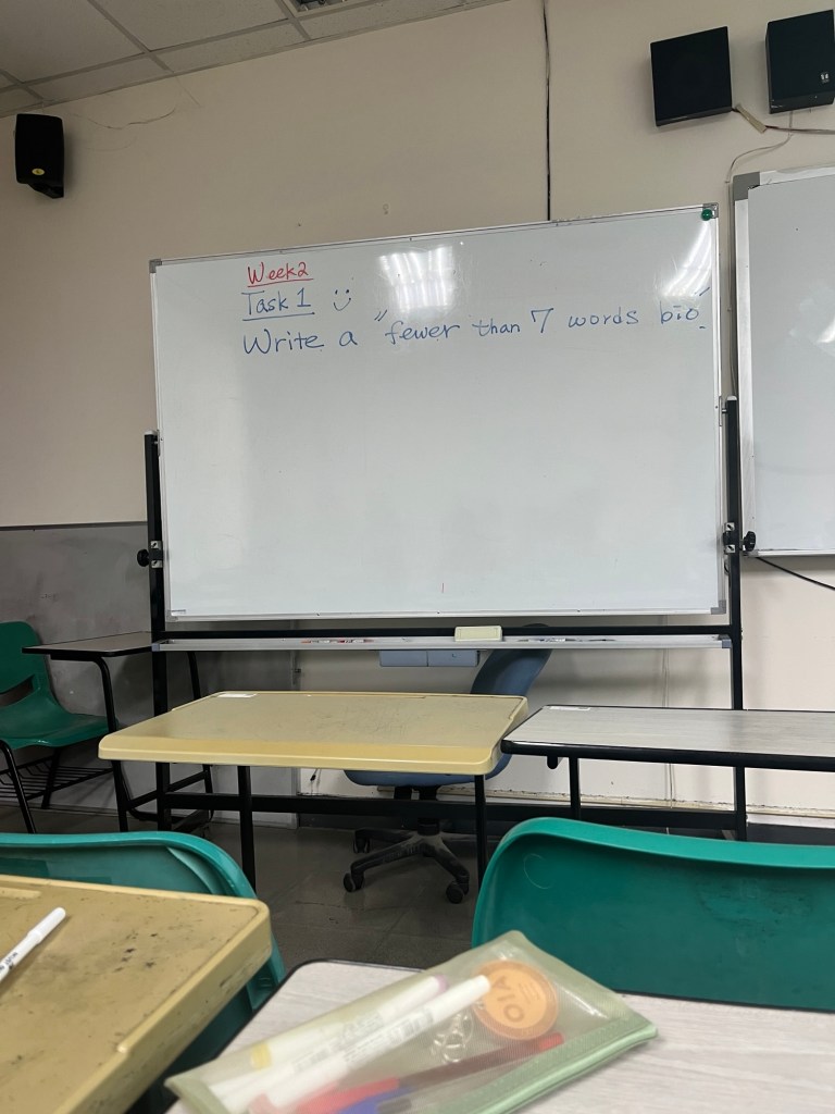 Die heutige Stunde beginnt einer einfachen Aufgabe. Wir sollen uns selber in 7 oder weniger Wörtern beschreiben, wie eine Art Instagram-Bio. „Do you all have access to the Wifi? Because I want you to use ChatGPT!“ Basierend auf unserem digitalen Fußabdruck können wir uns alternativ auch von der KI eine Bio geben lassen. Also falls die Aufgabe zu schwer sein sollte oder uns nichts einfällt. Spaßeshalber probiere ich das auch aus, mehr als „stunning person creating memories through visual art“ kommt dabei aber nicht rum. Da ist meine persönliche mit Stichpunkten wie „athletics, create, …“ doch deutlich spezifischer.
