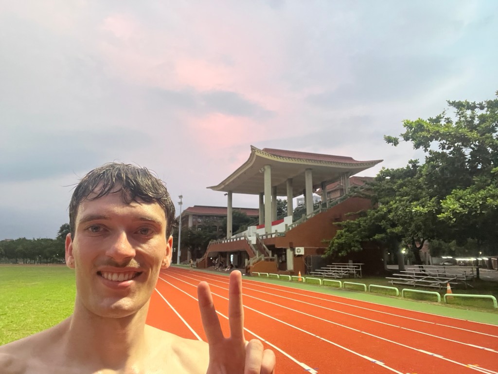 Obwohl Feiertag ist, gehen ein paar Leute der Leichtathletikgruppe trainieren, zu der ich letzte Woche eingeladen wurde. Per YouBike fahre ich 25 Minuten zum Nanzih-Campus, weiter hinten auf dem Gelände befindet sich das Stadion. Kaum jemand ist da, aber trotzdem tönt der Schulgong, ein ziemlicher Ohrwurm, über das Gelände. Da dies eh der schönste Campus ist, ist auch die Tribüne des Stadions in schönem asiatischen Stil mit aufsteigender Dachkante gebaut. Trotz Platzierung mitten in der Stadt ist die tiefrote Tartanbahn von so vielen Bäumen umgeben, dass die große freie Fläche sehr ruhig ist und wirkt, als wäre man dem Alltag entflohen. Gegen 16 Uhr bin ich da.