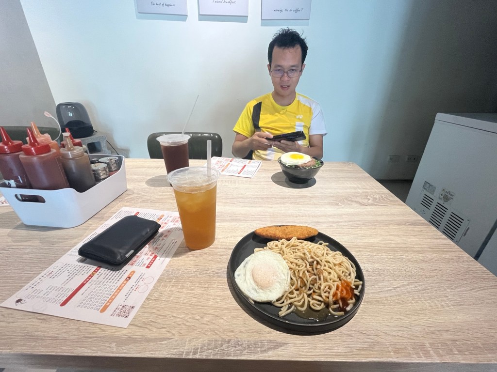 Am Wochenende muss man sich ja immer außerhalb des Campus um Essen kümmern. Mike fragt mich, ob ich zusammen nach etwas zu Mittag suchen will, also ziehen wir los. Vor den Campustoren probieren wir einen Nudel-Laden, der echt annehmbare Sachen anbietet. Die Portion ist zwar etwas klein, aber es reicht fürs Erste aus.