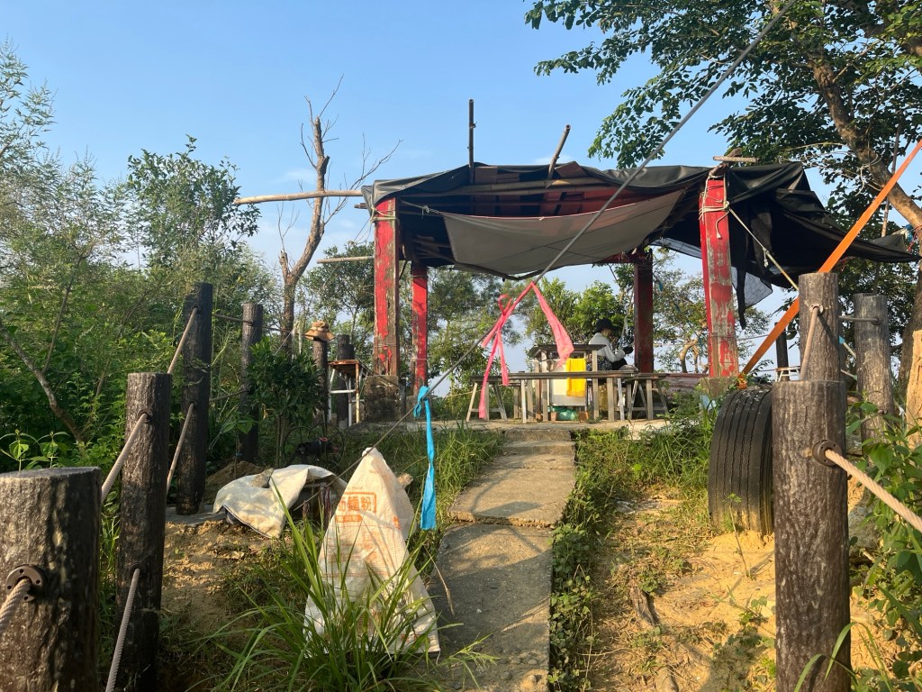 Mehrere Stellen haben kleine Bänke oder sogar kleine Reckstangen, an denen man theoretisch Workouts machen könnte. Zwei Runde Hin- und Herhangeln probiere ich aus, bevor ich feststelle, dass eine Stange lose ist und fast aus dem Holz rausfällt. An einem Barren mit besonders guter Aussicht stoppe ich, bis ein freundlicher Herr mir zu sagen versucht, dass die Aussichtsplattform nur ein paar Meter weiter ist. Ich danke ihm, allerdings ist der Blick von der Plattform deutlich eingeschränkter, und es sind mehr Leute am selben Fleck. Den höchsten Punkt habe ich hier wohl erreicht, aber weil ich noch Zeit habe, gehe ich in die andere Richtung weiter, sodass ich später wiederkommen kann. Die meisten Wanderer grüßt man mit einem freundlichen Nicken oder einfach mit „nǐ hǎo“. Viele sind zu zweit unterwegs und die, die es nicht sind, haben meistens etwas über ihre Handylautsprecher laufen, Musik oder Podcasts, Radio, … Ich folge den Schildern, die auch auf Englisch sind und gelange an einen sogenannten „Pavillon“, der allerdings mehr nach Obdachlosenzelt aussieht. Eine Frau sitzt in ihr Smartphone vertieft auf einer Bank, die unter einem provisorisch aufgespannten Zeltdach steht.