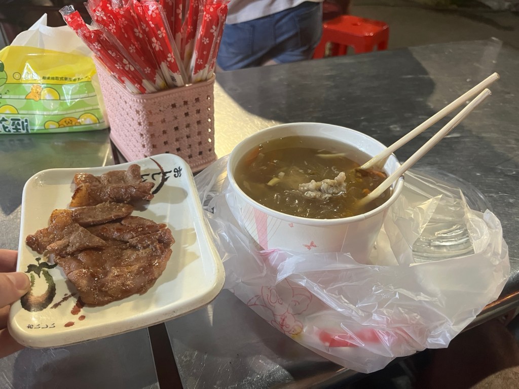 Nach langem Überlegen und Anschauen des Angebots entscheide ich mich für eine Tintenfischsuppe, die ein sehr gutes Preis-Mengenverhältnis hat. Erst will ich die irgendwo hin mitnehmen, entscheide mich aber, an einem Tisch neben dem Stand Platz zu nehmen. Der Inhaber, der kein Wort Englisch spricht, freut sich sichtlich, als ich mich hinsetze und kommt mit einem Teller Essen zu mir. Ohne zu fragen, sondern nur mit einem großzügigen Lächeln kippt er mir ein paar Fleischbällchen in die Suppe und zeigt mir einen Daumen. Ein paar Sekunden später stellt er mir eine Platte mit noch mehr Fleisch daneben. Ich weiß gar nicht, wie mir geschieht, aber sage „xièxiè“ und denke mir, dass ich das Fleisch am Ende ja übrig lassen kann. Dafür, ihm zu sagen, dass ich es nicht essen will, ist es eigentlich zu spät, dann müsste er mir eine neue Suppe machen. Und die Geste ist sehr freundlich gemeint, ich will ihn nicht verletzen. Blöderweise bleibt er aber stehen und zeigt begeistert auf das Fleisch. Na gut, sage ich mir, was in Taiwan passiert, bleibt in Taiwan. Zumindest die kulinarische Erfahrung. Ehrlich gesagt schmeckt das Ganze aber nur so semi. Was mich besonders wundert, ist, dass die „Tintenfischsuppe“ genannte Suppe weniger Tintenfisch enthält als das reingekippte Fleisch.