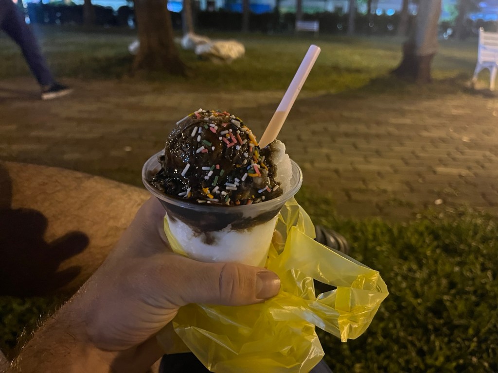 Zum Nachtisch hole ich mir noch ein Eis, das aus einer undefinierbaren Grundmasse (irgendwas zwischen gefrorenem Wasser und tatsächlichem Speiseeis) und einem Soßentopping besteht. Dazu ein Löffelstrohhalm, als beides nutzbar. Damit setze ich mich in einen nah gelegenen Park und genieße die Abkühlung bei einer angenehmen Grundwärme von etwa 29 Grad.