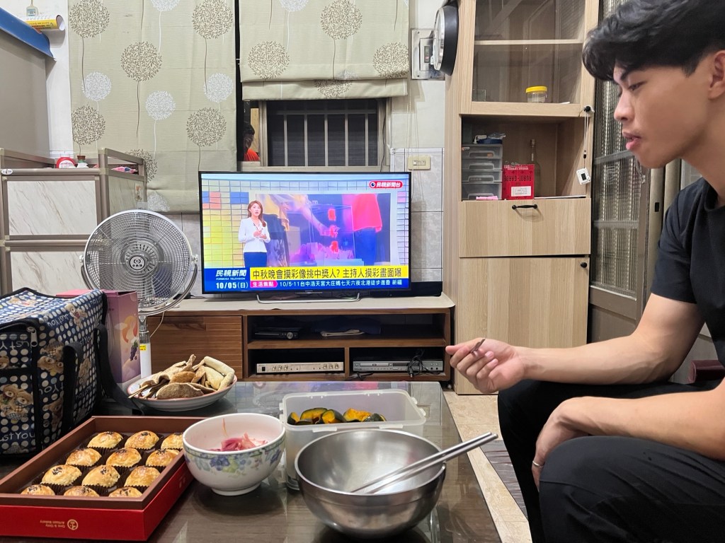 Vor dem Haus hat die Familie einen Gartentisch sowie einen Mini-Grill aufgebaut. Ich begrüße die Oma und darf drinnen erstmal das Klo benutzen, in das ich auf Nachfrage auch Klopapier schmeißen darf. Danach werde ich gebeten, auf dem Sofa Platz zu nehmen; ich soll doch bitte schonmal anfangen, Kürbisstücke und in Essig eingelegte rote Zwiebeln zu snacken, während im TV vor mir taiwanesische Nachrichten laufen. Unter anderem hat sich ein psychisch kranker vietnamesischer exchange student an einem Bankraub versucht und wurde von einer Überwachungskamera sofort identifiziert, was Byron zum Lachen bringt. Aus dem Kühlschrank soll ich mir eines der Biere aussuchen. Jedes davon hat 3% Alkohol und eine große Menge Zuckergehalt, mehr vertragen die Taiwanesen wohl nicht.