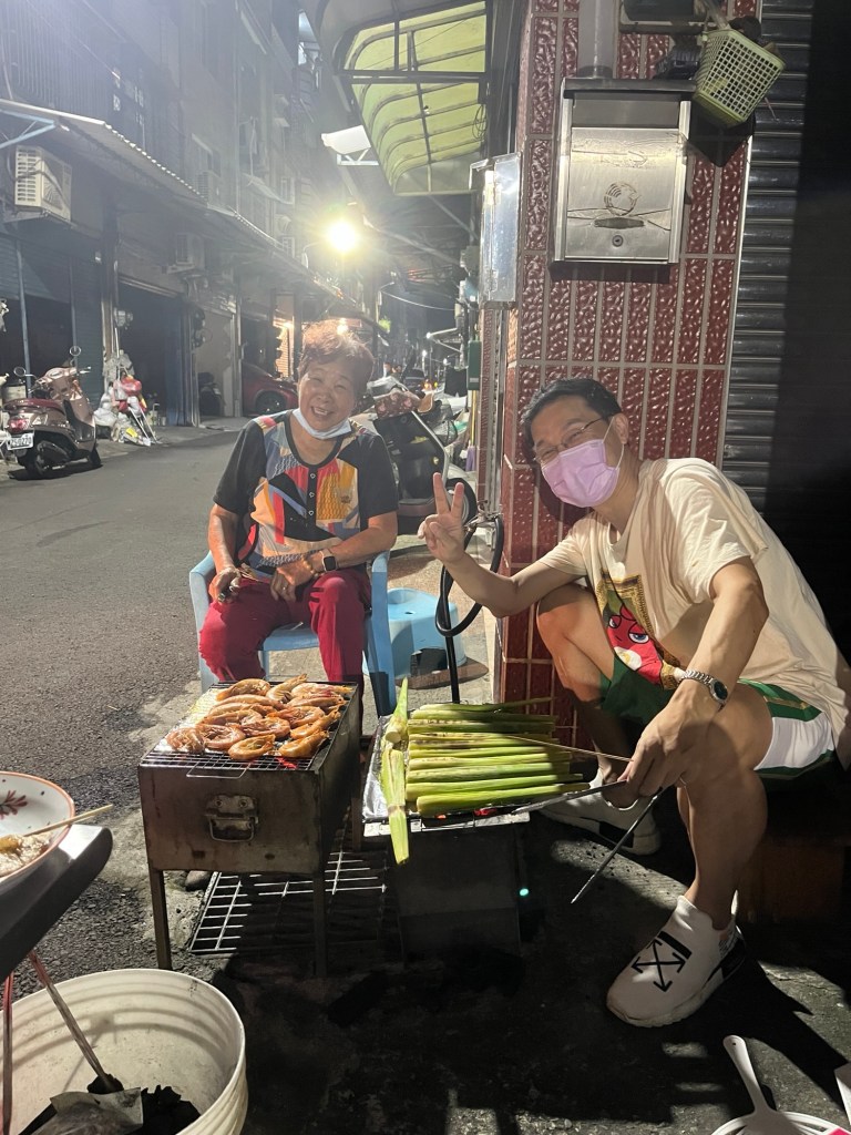 Ich darf mich dann raussetzen, zum Vater und der Oma, die beide den Grill bedienen. Nur einmal im Jahr machen sie das, weil heute das mid autumn festival ist. Mir wird eine Maske gereicht, wegen des minimalen Rauchs, der vom Grill ausgeht. Aus Höflichkeit (?) ziehe ich sie auf, aber irgendwie kommt mir das lächerlich vor und später setze ich sie ab. Man kann es auch übertreiben mit der Gesundheit. Später sagt Byron mir, dass viele Leute aus der Covid-Zeit Masken so sehr gewöhnt sind, dass sie ihr Gesicht nicht mehr zeigen wollen, was ein weiterer Grund für die starke Präsenz dessen im öffentlichen Raum ist. Der Grillanfacher ist ein Werbegeschenk der Grünen Partei Taiwans, die auch die Plakate in der Stadt prägen. Ich finde es absurd, mit den Gesichtern von Politikern Feuer anzufachen; was kommt als Nächstes, Klopapier damit? Die Familie lacht über meine Faszination dafür und schenkt mir den Fächer als „Souvenir“. Na vielen Dank, den kann ich jetzt über meinem Bett aufhängen.