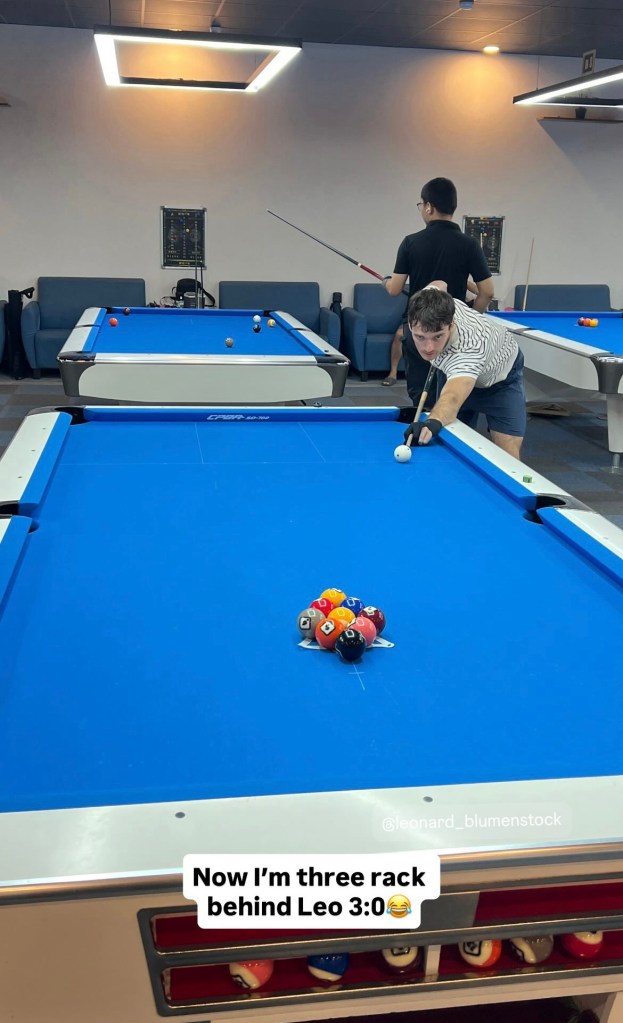 Damit die Spiele schnelllebiger werden, spielen Byron und ich jetzt 9-Ball. Die ersten neun Kugeln werden in einer Raute gelegt. Man muss immer die niedrigste Kugel anspielen und wer die 9 ins Loch schießt, hat gewonnen. Entweder macht man alle nacheinander rein und als letztes die 9, oder man probiert sich an einem trickreicheren Schuss, wenn man bspw. die zwei anspielen muss, dass man mit der zwei die neun trifft und reinmacht. Ich habe ziemliches Schussglück und führe 3:0, was Byron in seine Story posten muss. Er freut sich über jeden meiner Treffer, als wäre ich sein Schüler in einem Wettbewerb.