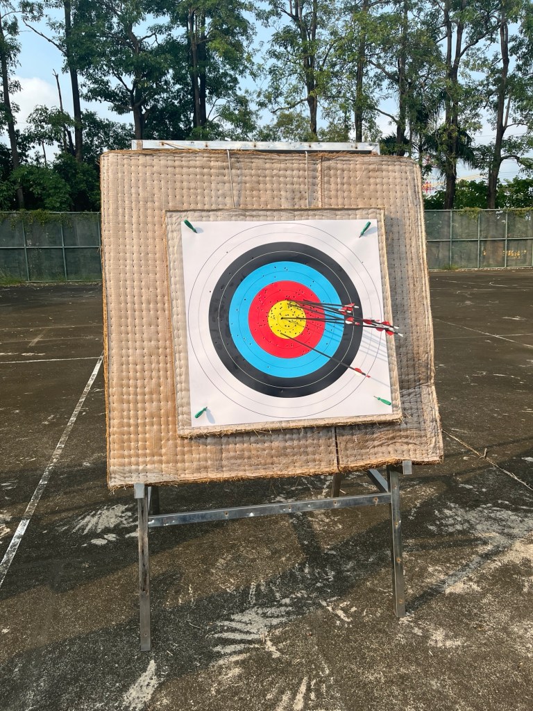 Bewusst gehe ich nicht ganz pünktlich zum Bogenschießen, die letzten Male haben immer wenige aufgebaut und der Rest nur zugeschaut. Ich komme genau rechtzeitig zum Warmdehnen, der Coach macht jeden Kurs genau das gleiche Programm. Ein paar Streckungen für die Finger, für die Schultern, Trizeps, Rücken, Nacken. Immer acht Sekunden, „yī,èr,sān,sì,wǔ,liù,qī,bāāāā!“ Irgendwie sind deutlich weniger Studis als sonst da, sodass ich wesentlich häufiger an die Reihe komme mit Schießen. Im Vergleich zur letzten Woche schieben wir die Zielscheiben weiter nach hinten: 7 Meter Entfernung heißt es ab heute.