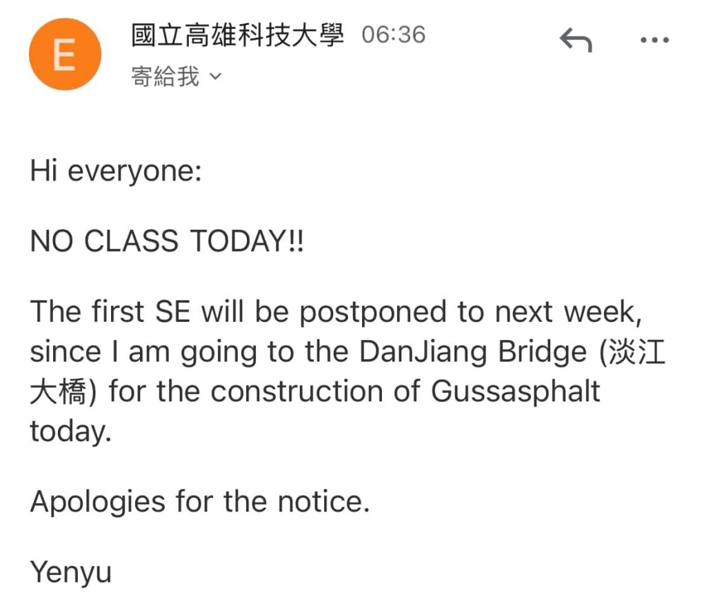 Eigentlich soll ich heute mit zwei Taiwanesen einen Vortrag über nordthailändische Asphalttestverfahren und deren mögliche Verbesserungen hinsichtlich der Temperaturbeständigkeit der Straßen halten. Netterweise hat einer der beiden mir direkt angesehen, dass das nicht mein Spezialgebiet ist und angeboten, dass mein Teil sich auf das Vortragen beschränkt. Das Sprechen in Englisch stellt für die Studis i.d.R. die größte Schwierigkeit dar. Meinen Folienanteil habe ich gestern Abend bekommen, also nutze ich den Morgen, um mir von ChatGPT sagen zu lassen, worum es bei den ganzen Diagrammen inhaltlich überhaupt geht. Dann geht aber die Nachricht rum, dass der Kurs heute ausfällt und die Präsentationen auf nächste Woche verschoben werden, da Herr Lin sich in Taipei befindet; er nimmt an der Errichtung einer Brücke teil.
