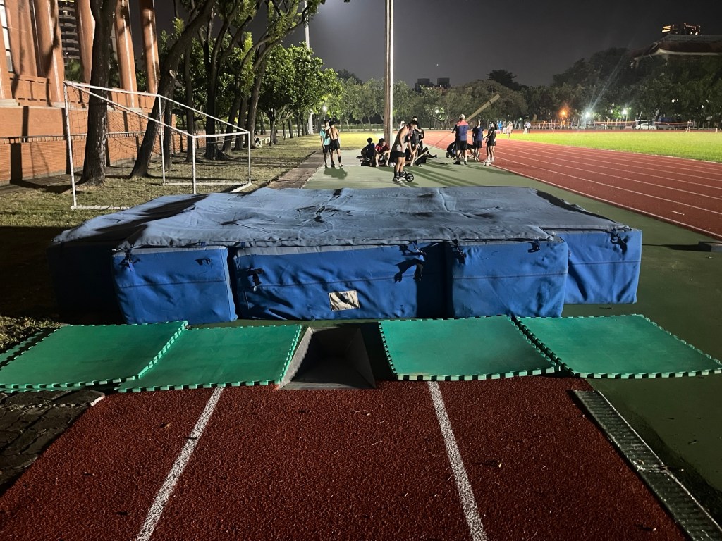 Jetzt kommt aber der wirklich wilde Part. Stabhochsprung, präsentiert Edward, als müsste ich vor Freude aus dem Häuschen springen. Es ist auch irgendwie süß, wie er das an die große Glocke hängt, um mich zu beeindrucken. Er ordnet an, die drei Matten an den Rand des einsam im Boden liegenden Einstichkastens zu verschieben. Die Konstruktion besteht nicht nur aus dem Mattentrio, darauf liegt nämlich noch eine Obermatte, die an den Seiten mit winzigen Karabinern verankert ist, sodass man eine gleichmäßige Fläche ohne Ritzen hat. Alle reden auf Chinesisch und ich schaue mich nur belustigt um, was ein paar der Leute zum Grinsen bringt. Wahrscheinlich sehe ich so richtig lost aus.