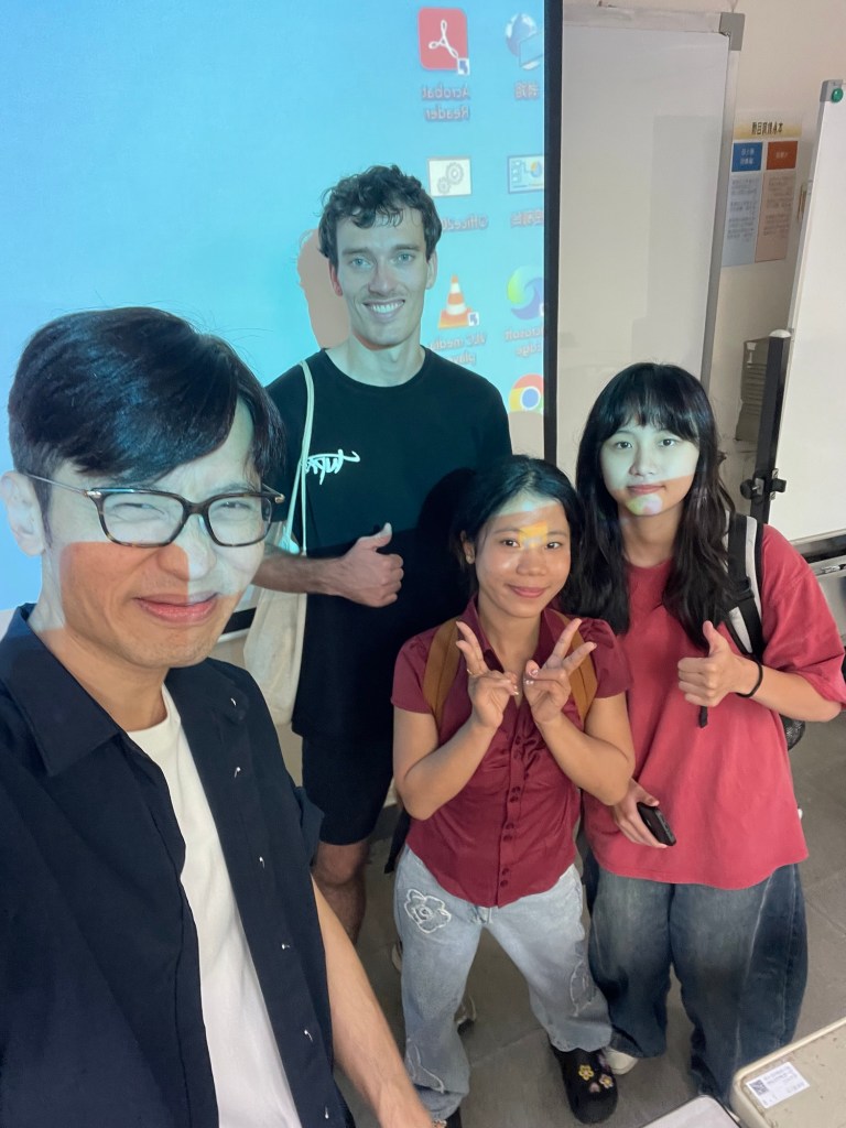 Ein bisschen Ablenkung schafft die Englisch-Stunde. Die erste Hälfte verbringen wir mit dem Thema unserer Präsentation, air pollution, und allgemein Klima und so weiter. Der teacher will wissen, wie viel wir bewusst laufen oder Fahrrad fahren. Als einziger melde ich mich bei ‚häufig‘. Er hat mich schon viel über den Campus laufen sehen, im Gegensatz zu allen anderen, die lieber Motorrad fahren, das findet er lustig. Ansonsten gehen wir die zehn Sätze durch, die meine Gruppe mittels ChatGPT vorbereitet hat, und sprechen sie gemeinsam und sehr langsam wiederholt durch. Nach der Pause präsentieren wir. Mit dem Mikrofon zur Klasse zu sprechen, kommt mir sehr komisch vor, gerade weil ich sowieso eine relativ laute Stimme habe. Außerdem bin ich unerwartet etwas aufgeregt, trotzdem klappt es ganz gut, die Begeisterung bei „JJ“ ist groß. Man könne sehen, wie viel Arbeitszeit in den Vortrag geflossen sei. Na klar. Er redet dann noch viel Chinesisch, was, weiß ich nicht, aber es ist langweilig. Am Ende der Stunde kommt er nochmal auf uns zu und fragt, welchen Aspekt der Präsentation wir selbst am besten finden. Eigentlich ein bisschen Kindergarten, aber im Grunde sorgt er sich vor allem darum, wie wir mit der Aufgabe umgehen. Für Molia bspw. war es der erste Vortrag überhaupt. Im Ernst? Ja. Und ja, sie hat auch in der Schule noch nie etwas vortragen müssen. Selbst bei der Nachbesprechung zittern ihre Hände noch. Jetzt verstehe ich besser, warum sie alles so detailliert durchsprechen wollte. Nicht dass ihr Part besonders gut zu verstehen war für die Zuhörenden, auf den Folien war viel zu viel Text, sie hat ihren Kopf mehr oder weniger hinter ihrem Handy versteckt und ihr Akzent ist wenigstens für mich sowieso äußerst schwer zu verstehen. Aber es geht für sie vor allem darum, es einmal geübt zu haben und der Lehrer spricht ihr gut zu, toll habe sie das gemacht. Mit uns als Gruppe will er noch ein Gruppenfoto machen, warum auch immer. Ich lasse es mir airdroppen, eigentlich ein lustiges Erinnerungsfoto.