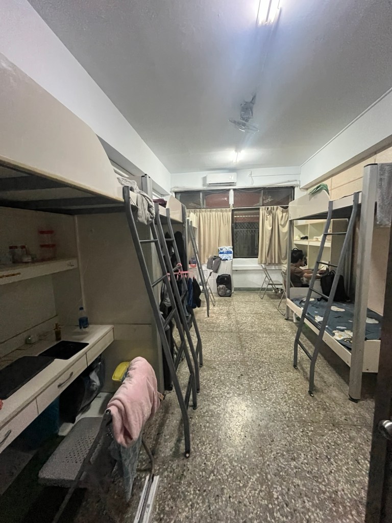 Dort gehen wir kurz in sein Zimmer, ein länglicher Raum im Erdgeschoss, der aussieht, als könnte er auch schonmal von Mäusen oder Ratten heimgesucht worden sein, besonders, weil die Mülltonnen direkt vor der Wand stehen. Das Zimmer hat vier Hochbetten mit Schreibtisch unten darunter sowie ein doppeltes Hochbett. Ein Roommate sitzt mit Kopfhörern an seinem PC und scheint uns nicht zu bemerken, sodass ich ein Foto machen kann.