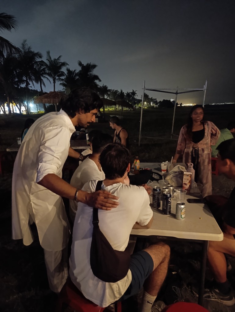Ich schätze die Menschenmenge auf vielleicht 100, es ist auch nicht ganz klar, ob Gäste an den Tischen einer Strandbar zum indischen Getümmel davor gehören. Ein DJ-Pult ist aufgebaut und ein paar wenige tanzen bereits zu klassisch indisch klingenden Klängen. Nach nur ein paar Augenblicken sehe ich Mohan, derjenige, der mir die indische Süßigkeit geschenkt hatte. Ich begrüße ihn mit einem Handschlag, Ihsan und Hasan lernen ihn kennen. Ein paar Minuten Herumgeirre folgen, schließlich stellen Ihsan und ich uns in einer Schlange an, an deren Ende man eine Kleinigkeit zu futtern bestellen kann. Entgegen unserer Erwartungen gibt es keine große Auswahl oder riesige Mengen an Essen, sodass der Reis und die Kartoffeltaschen hier umso wichtiger sind. In der Schlange stoßen dann auf einmal alle weiteren wichtigen Charaktere dazu: Anna und Buggi, Minda, Sascha, Muskan und Freundinnen von ihr, schließlich auch Sidd und Mario, den Deutsch studierenden Body Builder. Sascha ist das offensichtlich sehr unangenehm, er fragt mich ungläubig, „Ist mein Schüler hier??“ Außer ihn scheint es aber niemanden zu stören, gerade auch weil man den Altersunterschied zwischen den beiden an einer Hand abzählen kann. Noch mehr Inder aus dem Chinesischkurs tauchen auf, Vivek darf natürlich nicht fehlen sowie weitere, deren Namen ich nicht kenne.