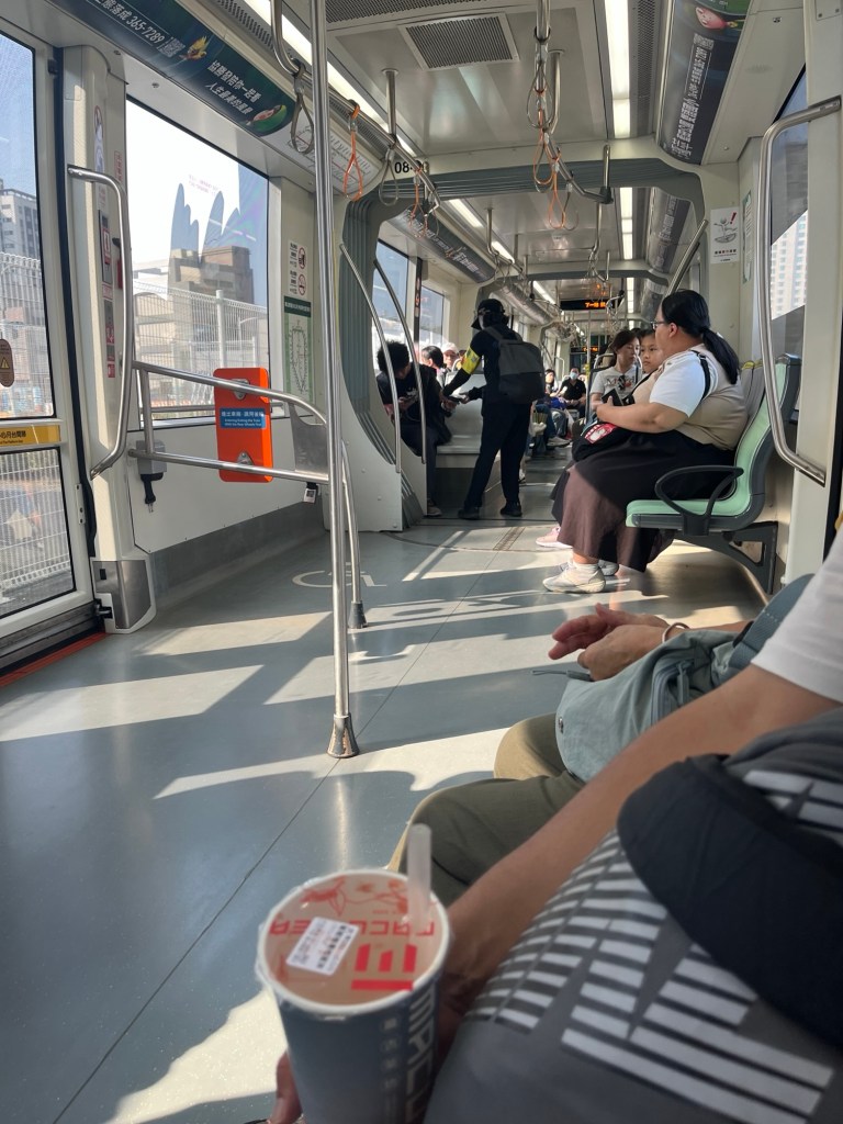 Mit verschiedenen Bubble Teas ziehen wir um die Häuser. In der Tram werden wir gleich doppelt von Omas ermahnt: Trinken sei verboten und außerdem sollen wir uns nicht unterhalten. Macht leicht aggressiv, vor allem weil die Tram und der Verkehr rundherum viel lauter ist, aber andere Länder, andere Sitten. Zum ersten Mal erlebe ich, wie Tickets kontrolliert werden, eine ältere Dame läuft mit einem Kontrollgerät durch den Kabinentunnel und piept an jeder EasyCard. Keine Schwarzfahrer. Ich mag mir gar nicht ausmalen, wie das Anprangern davon aussieht, womöglich kommen dann böse Blicke von überall und man wird fotografiert. Das ist zumindest meine Erwartung, so wie ich soziale Situationen in der Öffentlichkeit einschätze.