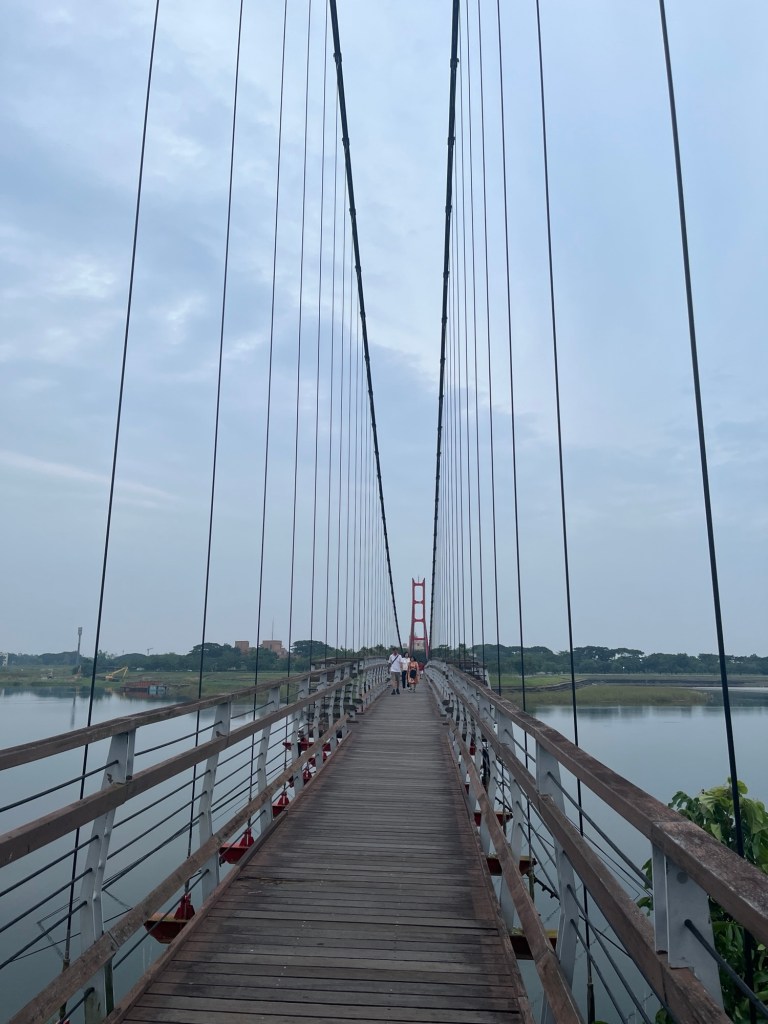 Am Ufer des Gewässers sind Solarpanels aufgereiht, die man leicht selbst als kleinen See betrachten kann. Eine entspannte Menge an Leuten sitzt auf einer kniehohen Mauer oberhalb des Ufers, unter einem Pavillon oder spaziert um den See. Wie ich es mittlerweile schon gewohnt bin, hört man ab und zu Musik aus den Lautsprechern der Smartphones. Auch wenn die Wolken kein bisschen Sonne geschweige denn eine sichtbare Transormation zur Nacht zulassen, ist es ein sehr schöner Ort, der Ruhe zulässt und ein interessantes Panorama zu bieten hat. Das unmittelbare Highlight ist eine Fußgängerbrücke, deren tragenden Stahlelemente rot lackiert sind und die selbst ohne meine Schritte wackeliger ist als die Suspension Bridge, auf der ich letzte Woche mit Sky war. Auf der gegenüberliegenden Seite des Sees steht ein Hügel, den man auch aus der Metro sehen kann und von hier erkenne ich einen Skywalk, der garantiert einen Besuch wert ist.
