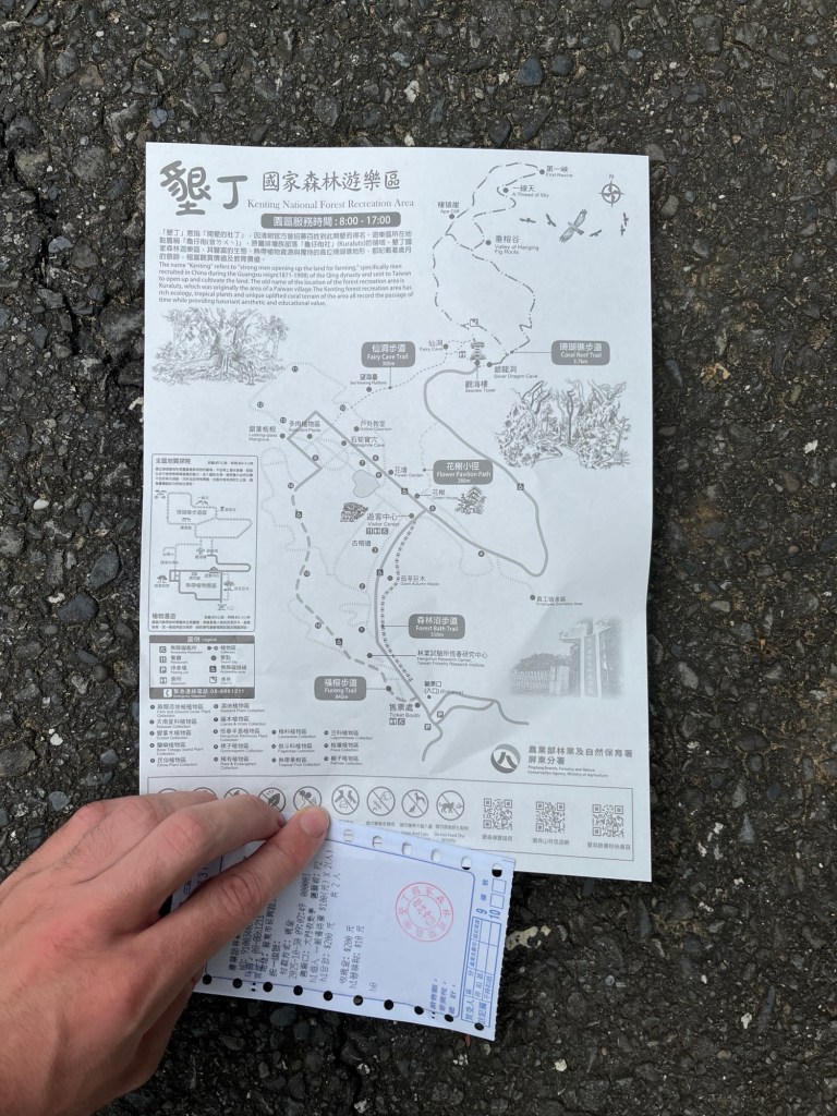 Bevor es gegen Mittag zurück nach Kaohsiung geht, nutzen Verena und ich die Zeit noch, um die Wanderroute vor unserer Haustür auszuprobieren. Den Roller müssen wir erst um elf zurückgeben, also trägt er uns noch die zehn Minuten Fahrtweg bergauf. Der Eintritt in den Park kostet und jeweils knapp 3€. Eine Wanderkarte auf dünnem Papier soll bei der Orientierung helfen.
