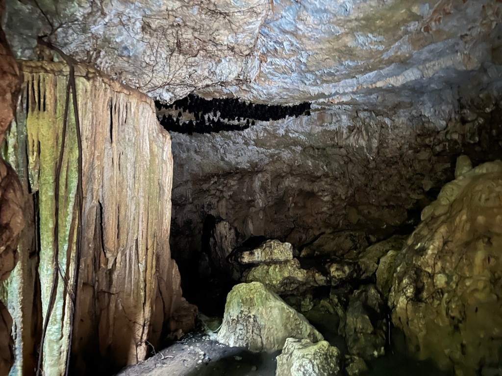 Neben vielen kleinen Bänken, Gewächshäusern und sonstigen Dekorationen sind Höhlen die Hauptattraktion. Zuerst die „Stalagmite Cave“: Fette Warnschilder lassen auf eine große Attraktion hoffen, allerdings gibt es nur einen etwa runden Raum. Eine Leiter führt auf den lehmigen Boden, auf dem man ein paar Schritte laufen kann. Die Tropfsteine sehen ganz nett aus, aber nichts, was man nicht schon gesehen hätte. Krasser sind dafür die hunderten Fledermäuse an der Decke, die zuerst unbemerkt geblieben sind. Ungestört fangen manche an, umherzuflattern und erschrecken uns damit ziemlich. Die schiere Masse an schwarzen Viechern beeindruckt schon sehr.