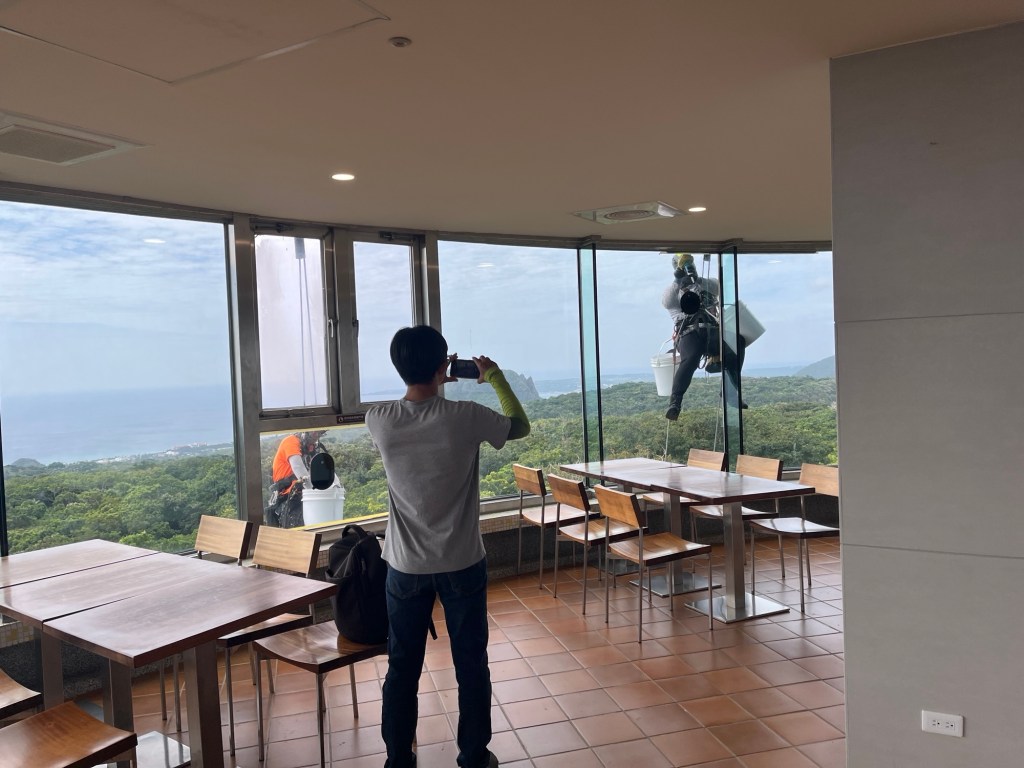 Außerdem sind über den Park viele Affen verteilt. Nicht überall sieht man sie, aber wenn, dann wirken sie gewaltig. Viel wuchtigere als ich sie aus Kaohsiung kenne, leicht angsteinflößend. Schnell weiter. Der letzte Stopp ist ein Aussichtsturm, in dem uns mal wieder viele sofort erkennbare Deutsche begegnen. Sie brauchen kein Wort zu sagen, schon die Art zu gehen oder die Bekleidung sagen alles. Abgeranzte Wanderschuhe, kurze enge Stoffhose und kariertes Hemd, sowie eine weit vorne auf der Nase sitzende Brille. Oben auf der Plattform sind wir aber weitgehend allein und können den Ausblick auf die Südspitze Taiwans in Ruhe genießen. Ein Stockwerk weiter unten beobachten wir zwei Fensterputzer, die bei bester Aussicht labern und die Scheiben reinigen.