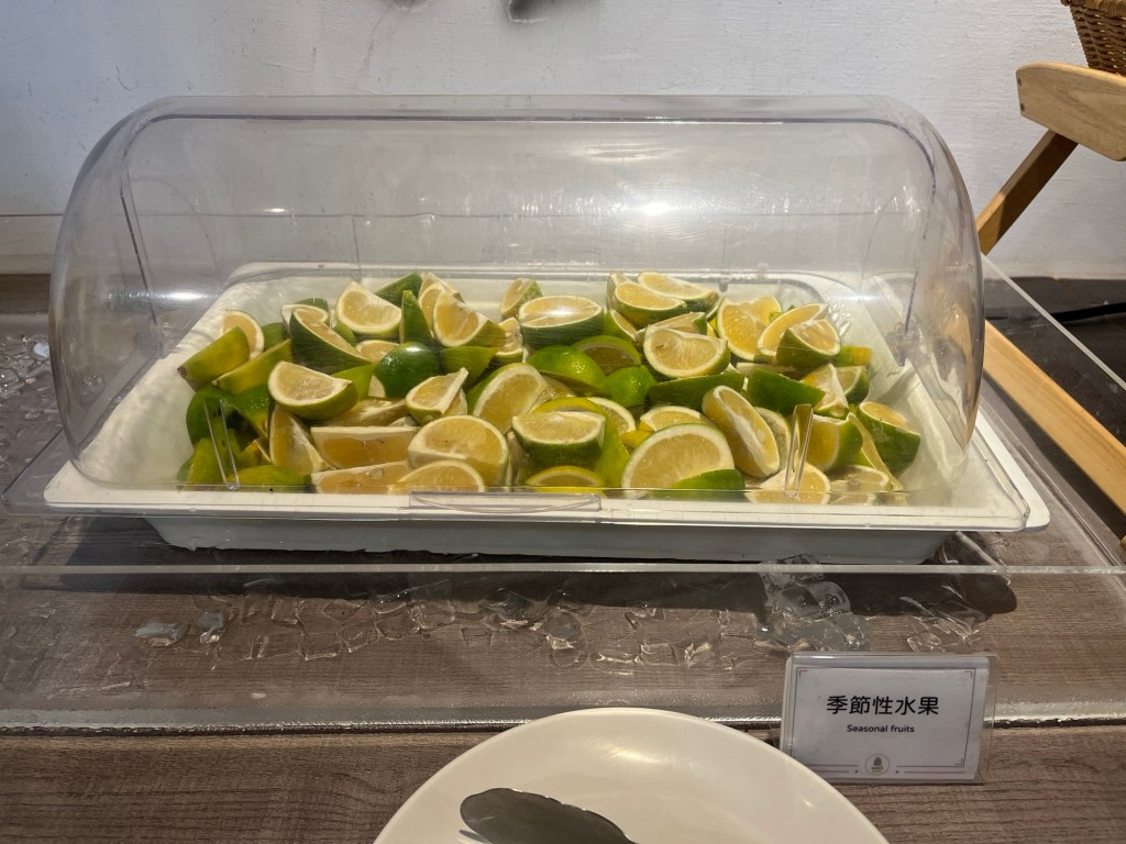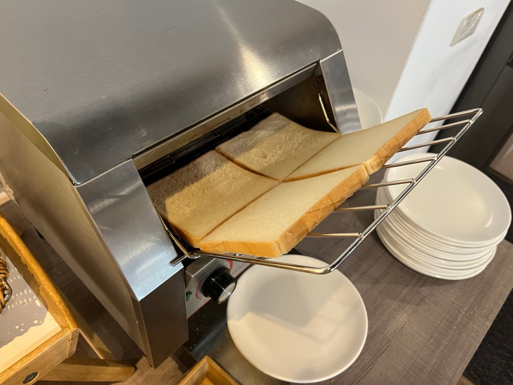 In der Übernachtung ist ein Frühstückscoupon inbegriffen, den wir einzulösen gedenken. Der gänzlich leere Speisesaal weist keinen Mitarbeiter auf, der diesen kontrollieren würde, aber das Büffet wird so oder so nicht leer. Kürbisstücke, Suppen, Reis, Nudelbowls und viele weitere herzhafte Nahrungsmittel reihen sich aneinander. Garantiert stehen die heute nicht zum ersten Mal auf der Theke. Ich brauche morgens aber einfach etwas Süßes, immerhin gibt es Tees, ein Toastbrotfließband und Marmelade aus winzigen Plastikbehältern.