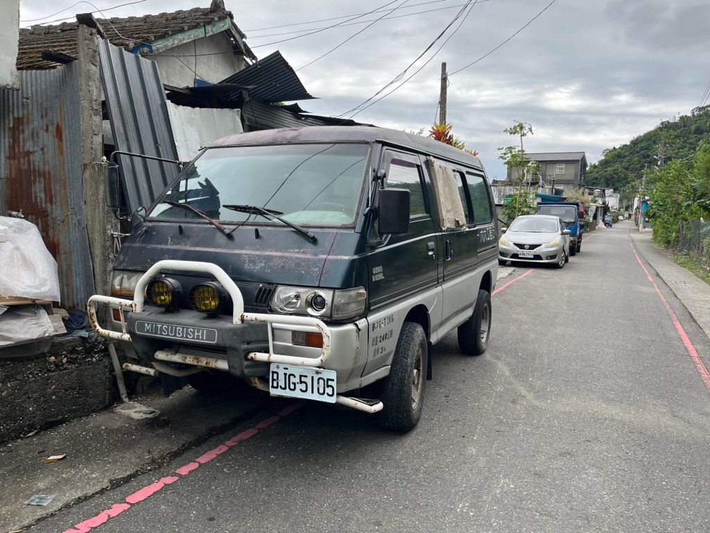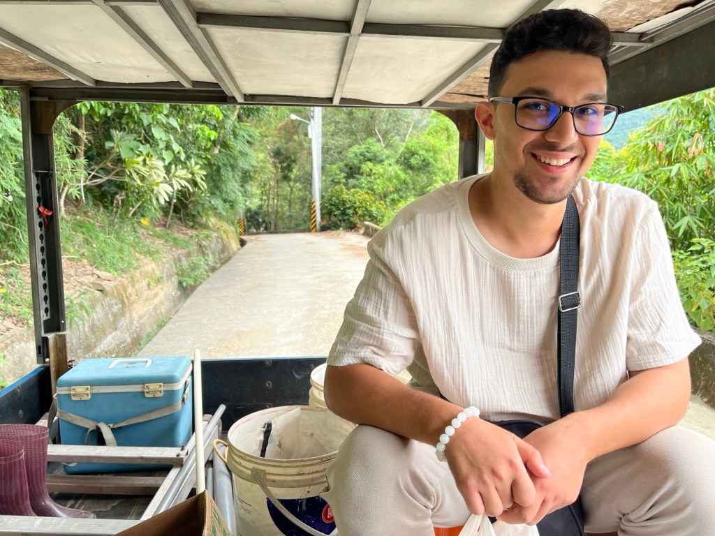 Also chillen wir wieder im Unterstand des Schreins, keine schlechte Idee ansgesichts des kommenden Nieselregens. Während der Verspeisung des Proviants fährt ein weiterer blauer Transporter auf der engen Straße, nur diesmal ohne Überdachung der Ladefläche. Er biegt auf das Grundstück ein, durch das rote Tor, nimmt Kurs auf das Haus 100 Meter weiter hinten, hält aber neben uns an. Ein kleiner Taiwanese in Flip-Flops, Adidas-Sporthose, dünner Cap und großem FILA-Aufdruck auf seinem Shirt steigt aus und fuchtelt mit seinen Händen rum, während er auf Chinesisch spricht. Ich schätze ihn auf vielleicht 50, die Beine sind ziemlich zutattoowiert. An seiner Handbewegung erkennen wir, dass er nach Fahrzeugen fragt. Dass wir ohne eigenes Auto hier sind, beeindruckt ihn sehr. Er kommt hochgelaufen und ist zum Glück nicht wütend, dass wir uns in seinen Privattempel gefläzt haben. Vielmehr strahlt er aus allen Poren und scheint ein großes Mitteilungsbedürfnis zu haben. Ihsan erbarmt sich, zückt seine Übersetzer-App. Jedes Mal, wenn der Kollege zu sprechen aufgefordert wird, double-timed er Chinesisch, vorübergebeugt mit dem Mund am Handy, als wäre es sein Mikrofon. Die wilden Handbewegungen und grundsätzliche Hibbeligkeit lassen ihn wirklich wie einen Rapper wirken.