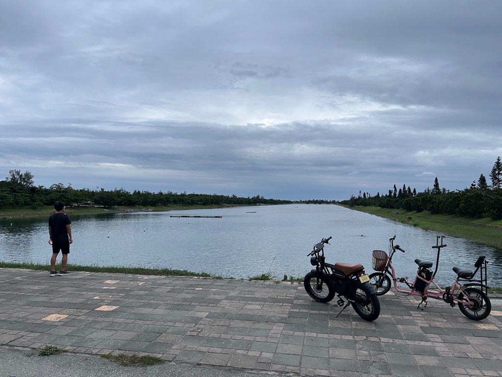 Obwohl wir so durchhängen, raffen wir uns auf, vor Sonnenuntergang, der schon um 20 nach fünf ist, nochmal nach draußen zu gehen. Eine letzte Sache, die ich in Taitung gerne gesehen hätte, ist das Ensemble von Stadtpark und rechteckigem See am nordöstlichen Stadtende, ganz in unserer Nähe. Mit YouBikes fahren wir die Straße entlang, bis wir auf einen Schlag die Stadt verlassen und in der reinen Natur sind. Der See, den Google mit „Floating Lake“ übersetzt, ist vielleicht 80 Meter breit und zieht sich in exakt rechtem Winkel ziemlich genau einen Kilometer in die Ferne. Hat das Ludwig XIV. errichtet oder wo bin ich hier gelandet?