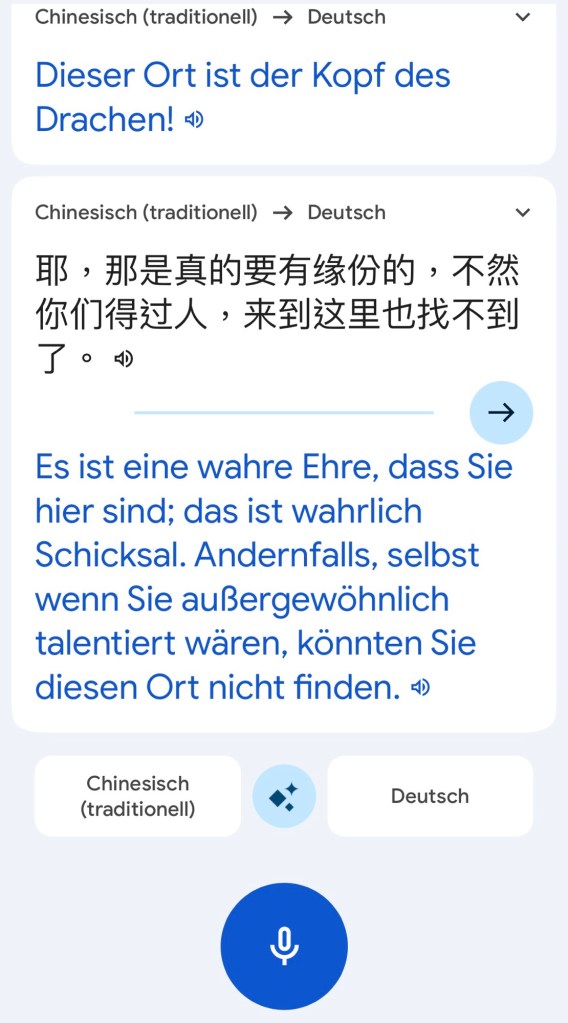 Den Schrein hat er wohl selber gebaut; wie vermutet, ganz neu. Die goldenen Löwenstatuen auf der Treppe sind noch nicht eingeweiht, weshalb sie in Plastiktüten stecken, bitte nicht anfassen. Die Drachenschlange oder zumindest irgendwas mit Drache ist die Gottheit des Tempels, die noch fehlt. Inspiriert sei das von der Bergform, wo der Schrein den Kopf des Drachen darstellt. Überprüfen kann ich es nicht, aber es klingt schon etwas beliebig. Na gut, Grundstück ist Grundstück, und alles muss ja irgendwie eine Story haben. Die Statue selbst steckt anscheinend irgendwo auf dem chinesischen Festland und soll hergebracht werden, wenn, ich paraphrasiere, die Lage sich beruhigt hat.
