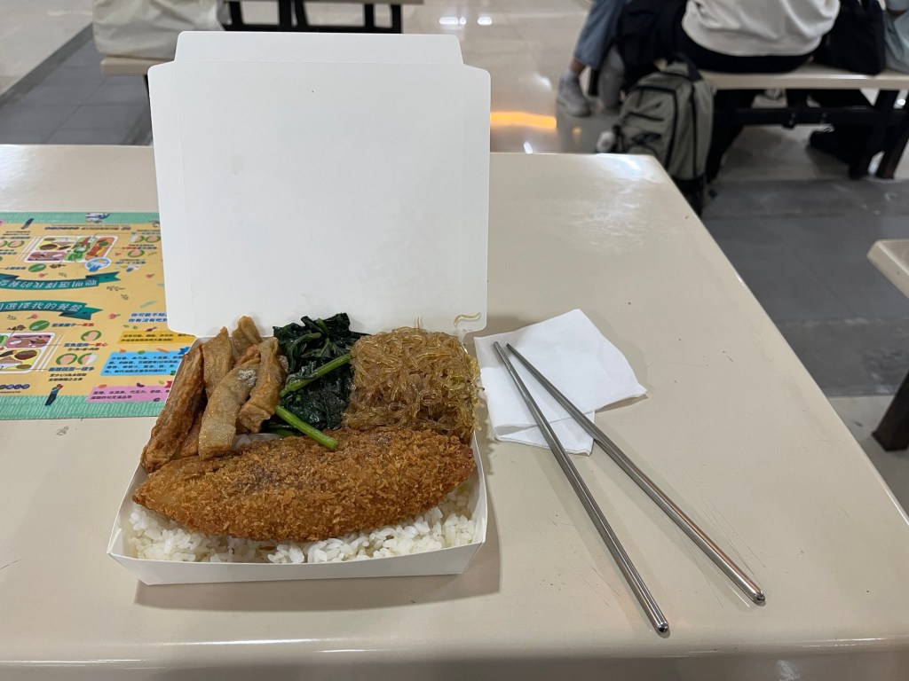 Die Mensa hat heute eine Art Ausfall. Es gibt keine großen Metallteller, das Büffet ist nur zur Hälfte gefüllt und auch Besteck ist Mangelware. Wir werden von André in der Schlange gespottet, total cool kommt er an und sagt „nǐ men hǎo?“ Bitte was? „Bei dir gibt’s heute Reis, bei dir gibt’s heute nichts“, sagt er und zeigt auf Sebastians und meine Essensbox. „Ich versteh’s nicht“ erwidert Sebastian, auch ich gucke verdattert und ernte dafür einen kumpelhaften Stoß von Andrés Schulter. Heilige Maria, bitte erlöse mich. Zum Glück findet auch Ashley uns und bietet freie Plätze an ihrem Tisch an. Wir sitzen also zu dritt da, Mike stößt auch noch an den Tisch, auf dem eine blaue Fahne mit Aufforderungen zu mehr Umweltschutz steht, warum auch immer. Er erkennt die Ironie und merkt an, dass er einen Lehrer gefragt hat, warum es so viele Plastiklöffel gibt. Naja, ansonsten muss man ja Fachkräfte bezahlen, die die Metalllöffel abwaschen und auch noch einen Wahnsinnslohn von 200$TD (5,70€) die Stunde bekommen, also überhaupt nicht rentabel für die Uni. Abgesehen davon, dass dieser Lohn auch für taiwanesische Verhältnisse zumindest nicht exorbitant hoch erscheint (immerhin kosten die Mahlzeiten oft über 100$TD, also ca. 3€), scheint das Konzept des Geschirrspülers hier noch erfunden zu sein, wenn ich der Aussage Glauben schenken darf.