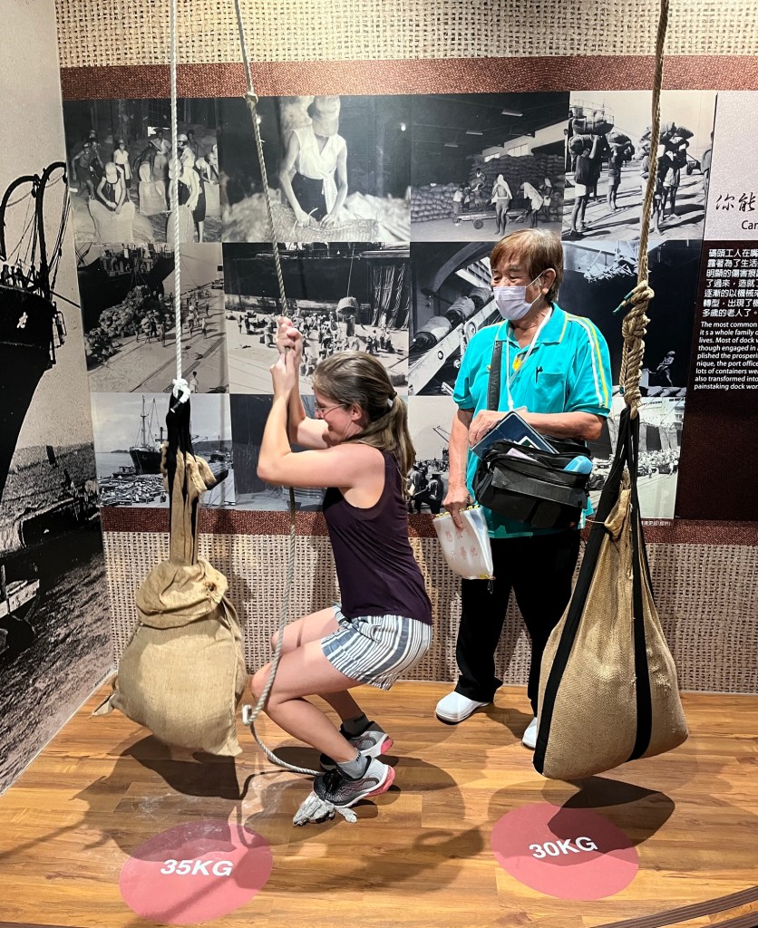 Wir gelangen an eine interaktive Station, bei der Seile mit 30kg schweren Säcken von der Decke hängen und man persönlich nachempfinden kann, wie die Hafenarbeiter sich ihre Rücken ruiniert haben. Bei jeder der kommenden Stationen werden wir aufgefordert, möglichst viele Bilder und Videos zu machen. Für den Blog ist das ja ganz nett, aber Chén scheint davon auszugehen, dass wir das noch unseren Enkeln zeigen werden.