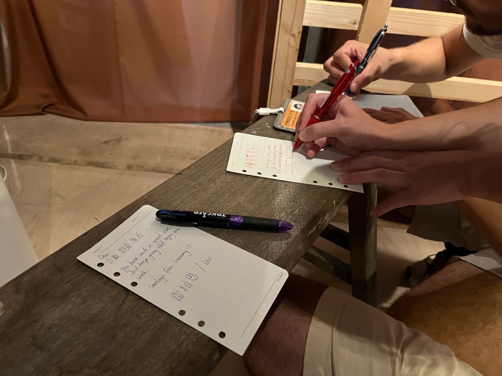 Danach bittet er uns, ihm auf jeweils einem kleinen Zettel einen Brief bzw. Feedback zu schreiben und seinen Namen auf Chinesisch zu schreiben, dafür legt er seinen Freiwilligenausweis als Vorlage hin. Also texten wir drei. Um das cringe-Level zu steigern, liest er meinen Text natürlich sofort laut vor. „You have such a good vibe. Aw, thank you!!“ Ja, keine Ursache. Ich habe das wirklich ernst gemeint, denn seine Begeisterung für die Sache kann man ihm nicht abstreiten. Ein Kollege von ihm macht übrigens im Hintergrund die ganze Zeit Fotos – es ist gleichzeitig merkwürdig und nicht merkwürdig, denn man ist es eben so sehr gewohnt.