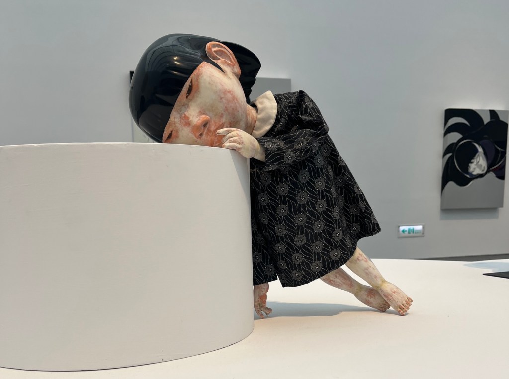 Aurora führt mich schrittweise durch alle Abteilungen, wobei sie (nicht verwunderlich) einen sehr guten Blick dafür hat, welche Kunstwerke interessant sind und welche man rushen kann. Der erste Raum ist vermutlich der, der mir am besten gefällt. Von der ebenfalls sehr hohen Decke klimpert Debussy herunter; Aurora will es mir erklären, aber ich kenne das Stück, „L‘Isle Joyeuse“. Als ich anfange über Ravel zu reden, überschreite ich sogar ihr Wissen über den Impressionismus. Mit Kunst kenne ich mich ja gar nicht aus, aber vermute, dass die Gemälde sich allesamt in dem Stil bewegen. Mir gefallen quasi alle Werke im Raum, die von drei verschiedenen Künstlern aus Japan und Südkorea stammen: Bilder und Figuren von Kindern, in deren Blicke ein Wandtext viel, viel Paychologie interpretiert: comichafte Superhelden aus Animes, die Aurora schon in ihrer Kindheit (Jahrgang 1973) gesehen hat; und leicht verstörende Figuren mit riesigen Augen.