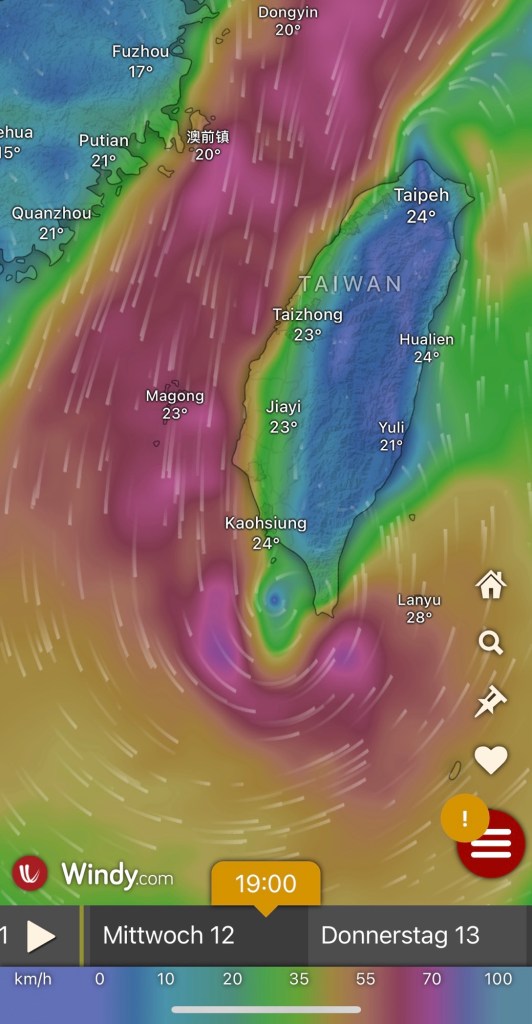 Recht glücklich mit der Stunde gehe ich nach Hause. Noch ist der Himmel ruhig, die Straßen belebt. In unser cringlastigen neuen WhatsApp-Gruppe, die André erstellt hat, ohne dass jemand danach gefragt hat, gibt er zu verlauten: „Alle warten wohl auf den Bürgermeister und 20 Uhr.“ Na dann, Trommelwirbel… Morgen fallen alle Kurse aus und Büros der ganzen Stadt bleiben geschlossen. Die Info kommt aber auch sofort über die Internationals-Chattgruppen rein, mit dem mittlerweile bekannten Hinweis, Instant-Nudeln genauso anzuhäufen wie Taschenlampen, Batterien und möglichst die nächsten Tage drinnen zu bleiben. Ich hoffe, dass es diesmal wirklich einen Grund für die Warnungen gibt, nachdem die erste Taifunwarnung vor einigen Wochen in ein paar Stunden Nieselregen aufgegangen ist. Der diesmalige Taifun Fung-Wong soll laut Windy mit seinem Epizentrum südlich der Stadt auftauchen, sodass wir wirklich voll drin sein müssten.