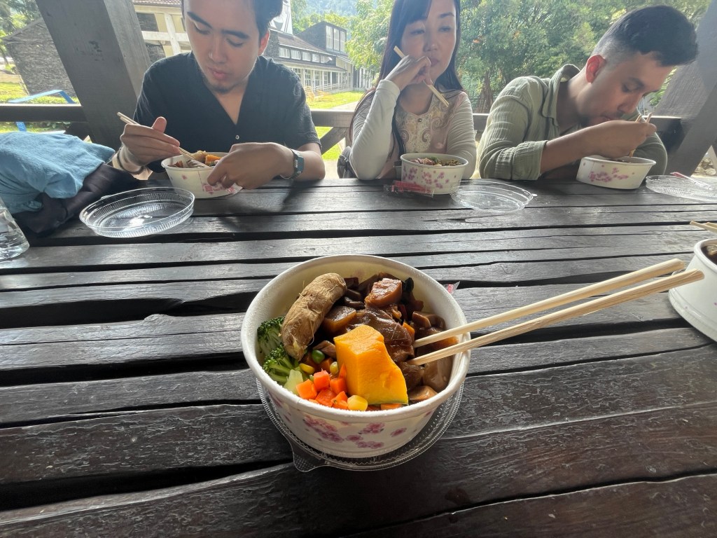 In einem Küchenhaus wird Essen im industriellen Maßstab hergestellt. Da es drinnen zu voll ist, geht meine Gruppe in einen hochgestelzten Holzpavillon, wo wir auf das Mittagessen warten. Mit am Tisch sitzen unter anderem eine Vietnamesin, mit der wir schon auf der Hinfahrt gesprochen hatten und eine Mongolin, deren Herkunft von großem Interesse ist. Dania, wenn ich mich richtig erinnere, kommt aus Ulaanbaatar und erzählt von ihrer Familie, in der es nicht unüblich ist, einen Hof mit 50 Pferden zu besitzen. Die Tiere seien auch heute noch das Fortbewegungsmittel der Wahl, zumindest auf dem Land. Die weiten Steppen sollen wunderschön sein, da widerspricht sie nicht. Ihsan interessiert sich besonders für die mongolische Kultur, auch weil es entfernte Gemeinsamkeiten mit der türkischen gibt. Beispielsweise die Hütten, in denen auch heute noch viele Nomaden wohnen, waren auf heute türkischem Boden bis zur Errichtung des Osmanischen Reiches im Tengrismus üblich. Dania ist am Beginn ihres Studiums in Taiwan und checkt lustigerweise nicht ganz so viel von dem, was wir sagen. Es wird wohl auf sprachliche Differenzen zurückzuführen sein, aber ganz oft fragt sie uns etwas, das wir im Satz zuvor erklärt haben, Koby kann da nur schmunzeln.