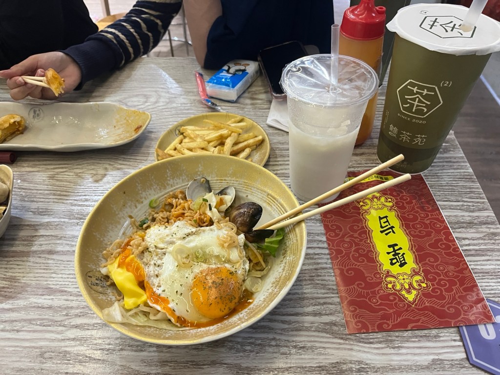 Nach der Stunde gehe ich mit Minda in das angrenzende Essensviertel, das ich dank der Trainingsgruppe nun wirklich gut kenne. Einen Bubble Tea später setzen wir uns in eine Nebenstraße zu zwei befreundeten Indonesierinnen, die sich Fried Noodles bestellt haben. Wir tun es ihnen gleich, aber der Laden ist trotz sehr netten Mitarbeiter eine Katastrophe. Versalzene Pommes, Pork (für die drei besonders schlimm) und anderes Fleisch in extra vegetarisch bestellten Gerichten, und mein „Ei“ enthält so viel flüssiges Eiweiß, dass ich nach der Hälfte abbreche, aus Angst vor Salmonellenvergiftung oder Schlimmerem.