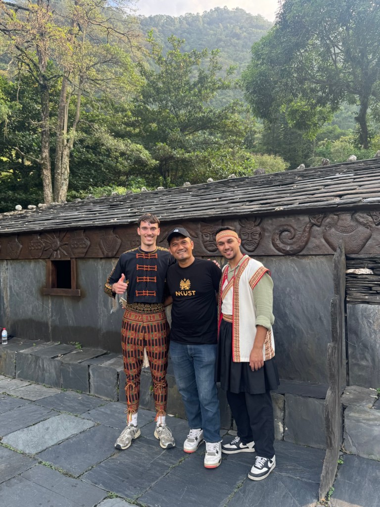 Weiter unten begutachten wir die Hütten etwas genauer. Schöner Stuck ziert sie von außen, und die Türen sind dermaßen niedrig, sodass selbst kleinere Leute ihren Kopf einziehen müssen. Die Reiseleiterin spricht recht leise, aber eine Umhänge-Bluetoothbox lässt einen diesen Umstand fast gar nicht bemerken. Andere Reisegruppen hier erinnern mich fast schon an Berlin, Fotos machende Asiaten in großer Menge sind mir nicht unbekannt. Ein Mann der Gemeinschaft leitet kleinere Gruppen zu traditionellen Spielen/Zeremonien an. Bei einer stehen sieben Leute im Kreis mit spitzen Lanzen, um einen Strohball aufzuspießen, der in die Luft geworfen wird. Was dem Sieger gebührt, weiß ich nicht, aber spaßig ist es. Außerdem gibt es eine Art umgekehrtes Seilziehen, bei dem zwei Leute um die Drückherrschaft eines dicken Bambuspflocks kämpfen. Ihsan ist bei bester Laune, macht schon den ganzen Tag Späße mit Vanessa, Muskan und Minda, veräppelt sie bei jeder Gelegenheit. Ganz langsam bin ich genervt, auch weil mich die Hitze dehydriert.
