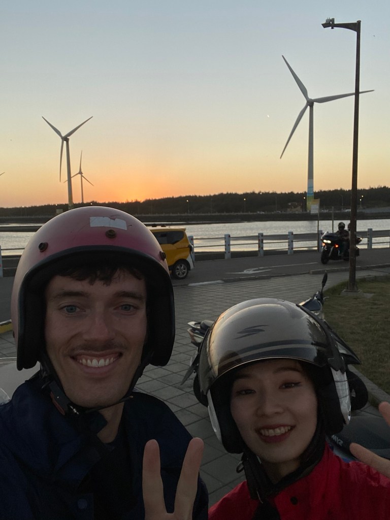 Weil ich nebenbei frage, ob Taichung einen Strand hat (die Stadt liegt nämlich etwas weiter im Land als Kaohsiung oder Tainan), ändert sich der Tagesplan dahingehend. Ziel sind die „Gaomei Wetlands“, James hatte sie mir empfohlen. Eine gute Dreiviertelstunde braucht man dahin mit dem Roller, auf halbem Weg geht es steil bergab. Dass Taichung so hoch liegt, war mir vorher gar nicht aufgefallen. Der weite Blick auf die Vorstadt am Meer mit ihren Fabrikschornsteinen und Windrädern ist irgendwie malerisch, auch wenn es vor Ort vielleicht nicht besonders idyllisch ist. Positiv fallen mir jetzt die Taichunger Busstationen auf, die einheitlich designt sind und einer Form folgen, die nach zwei elliptischen Wellen aussieht. Kurz vor knapp erwischen wir einen Spot, an dem die Sonne noch für etwa 5 Minuten zu sehen ist, bevor sie hinter einem kleinen Hügel verschwindet. Ich hätte gerne mehr vom Meer gesehen, aber es ist besser als nichts. Massen an Touristen stört es offenbar ebenso wenig, sie schießen tausende Fotos und starren in die Weite. Auch Jessies Hauptmotivation scheint ein gutes Instapic zu sein. Nicht nur darf ich sie ablichten, auch ich werde (schon den ganzen Tag) gefragt, ob ich Fotos von mir haben will.