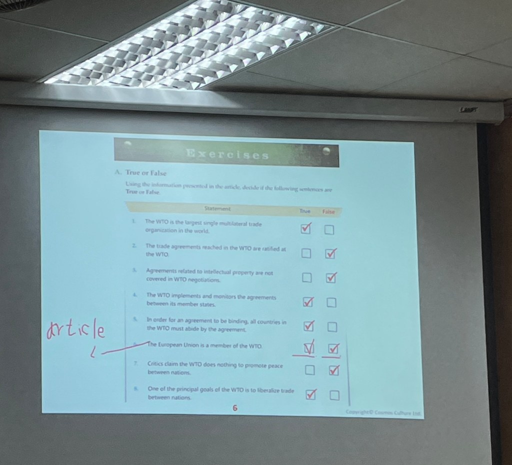 Bevor die Ergebnisse von je einem Gruppenmitglied angeschrieben werden (ich als Stenograph dieser unterhaltsamen Sitzung lehne mich entspannt zurück), soll man sich die Liste an Aussagen durchlesen, um die es geht. Es geht um die WTO und ein paar basic facts. Dass die Europäische Union Mitglied ist, markiert Tracy als falsch (ihrer Meinung nach sind es nur die einzelnen Mitgliedsstaaten), was allen voran Kaan nicht durchgehen lassen will. Es steht Aussage gegen Aussage und alle fangen an zu googeln. Tatsächlich ist die EU Mitglied, und nicht erst seit Kurzem. „Since when is it?“ fragt sie. „1995, 1. January.“, womit sie Gründungsmitglied sein dürfte. „Okay, your idea is maybe true.“ Maybe? „I think, article is maybe old.“ Interessanter Artikel. Sie korrigiert dann jedenfalls, gesteht sich den Fehler ein. „Student! EU is member of WTO. Do you understand?“ Ich hoffe, sie hat es verstanden.