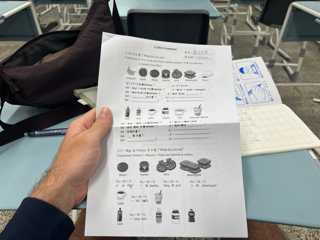 Zu Chinesisch fahre zum ersten Mal mit Pulli, wer weiß, wie frisch es später noch wird. Wie sonst auch lässt Peiti uns längst bekannte Silben buchstabieren, fast wie in einer Long-Term-Zeitschleife. „How to spell?“ „S-H-E-N, M-E“. „Which tone?“ Die Stimmen mehren sich, mit in der Verlosung sind erster, zweiter und vierter Ton. „Second tone. Shén me!“ Und so weiter; ich schalte auf Autopilot. Sebastian macht schon gar nicht mehr mit. Dann spielen wir in zwei Gruppen stille Post, wobei die erste Person eine Karte mit ungefähr 7 chinesischen Schriftzeichen bekommt. Karte weggelegt und Nachricht weitergeflüstert, die Reihenletzten müssen sie an das Whiteboard schreiben. Es geht ausschließlich um Sätze oder Aufzählungen, die wir in exakt dieser Form bereits rauf- und runtergelernt haben. Trotzdem verwandeln die berüchtigten Pappenheimer sie in Kreationen, die ihnen in nichts ähneln. Am Ende steht es trotz dessen oder dank der kriminellen Missachtung des Postgeheimnisses zwei zu eins. Nach der Pause sprechen wir gemeinsam Lückentexte durch, abgesehen davon kann ich mich bereits am Abend nicht mehr erinnern, was wir gemacht haben. Nur ein Arbeitsblatt bekommen wir als Hausaufgabe mit, das klingt doch spannend.